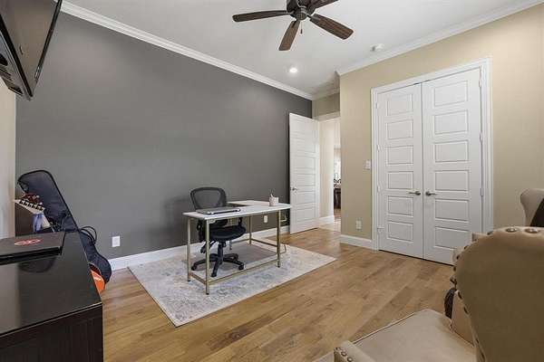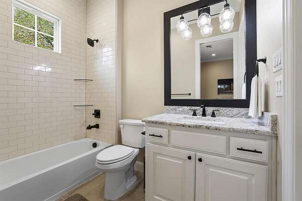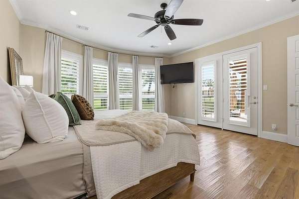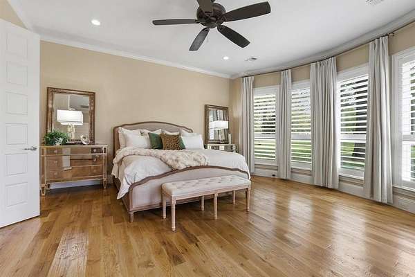 The luxurious primary suite offers a private retreat with large windows, plantation shutters, and a spa-inspired ensuite bath complete with a standalone soaking tub and an oversized walk-in closet. All additional bedrooms are generously sized with ample storage and high ceilings throughout.