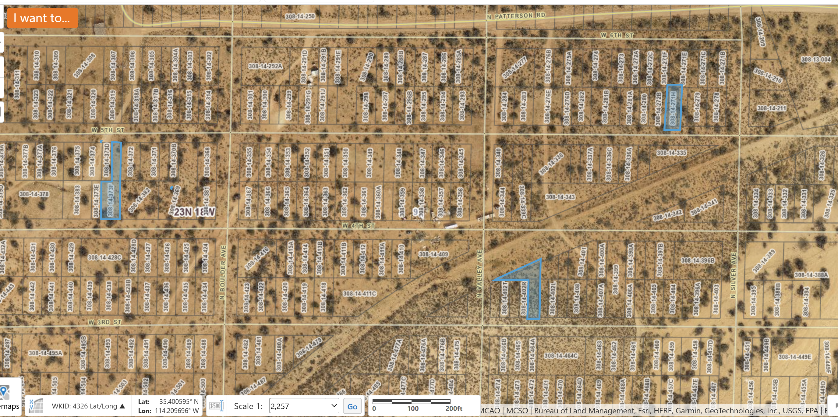 According to Google Maps, these two parcels lie just beyond the town boundary of Chloride Arizona, one of those unique little remnants of the mining age inArizona that retains its character and independence as the years pass. In Chloride you will find your restaurant, bar, VFW hall, small hotel, gun-slinging western show, post office, and market. The property offers easy car access just a few hundred feet south of the Chloride Cemetery. Although the official planned streets are not bladed, the dirt track from Patterson Lane arrives right to the West corner of the northern parcel on 5th Street, with 2600 sq. ft. The southern parcel is twice as large, 4800 sq. ft., and has frontage on 4th Street. Hablamos en español si prefieres.