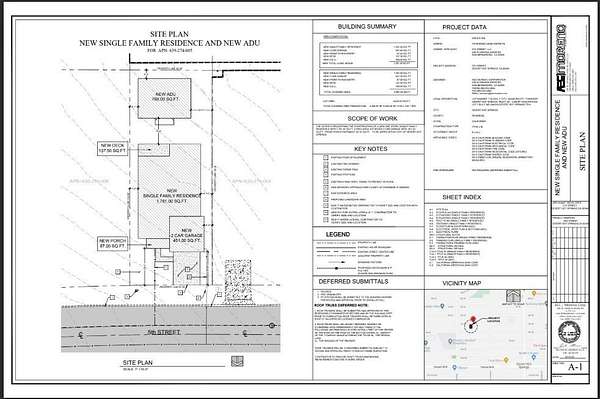 New construction opportunity in Desert Hot Springs! This planned home will offer approximately 1,781 sq. ft. of living space with a well-designed floor plan. Plans are complete and ready to be submitted to the city, providing a great opportunity for a buyer or investor to move the project forward. The main home will feature a spacious master bedroom with a walk-in closet and private master bathroom, plus two additional bedrooms and one full bathroom. The layout includes a family room, a kitchen with a pantry closet, and a dedicated laundry room. A two-car garage provides convenient parking and additional storage. Additional features include a new front porch entry, a new deck, and a detached 768 sq. ft. ADU in the backyard, offering excellent potential for rental income, guest quarters, or extended family living. Located on a vacant lot in the growing city of Desert Hot Springs, this is a great opportunity to build and own a brand-new property in the Coachella Valley.