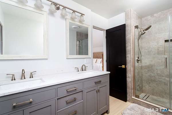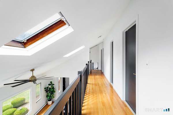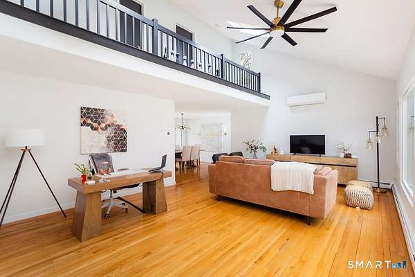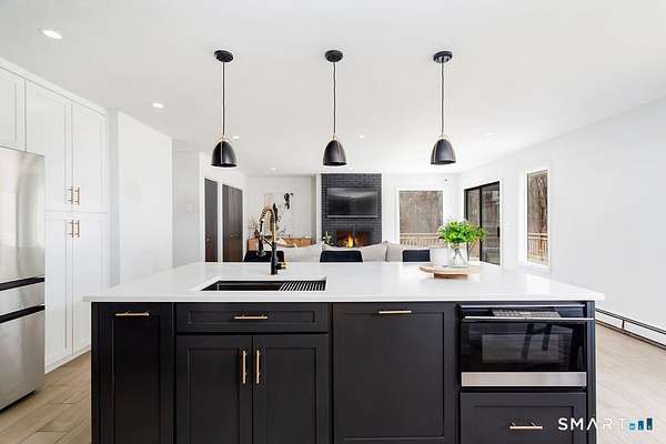 Set on a private, tree-lined lot, this 4-bedroom, 2.5-bath contemporary blends open space with clean, updated finishes. The heart of the home is a fully remodeled kitchen with quartz countertops, stainless steel appliances, a large center island, and modern pendant lighting. It opens seamlessly into a bright family room with a wood-burning fireplace and sliders leading to an expansive deck overlooking the lush, level backyard. The main level also features a dramatic living room with soaring vaulted ceilings, a loft overlook, and hardwood floors that extend into a formal dining area bathed in natural light. The primary suite sits on its own level and offers a spacious layout, a walk-in closet, and a fully updated bath with a double vanity and glass-enclosed shower. Upstairs, three additional bedrooms provide generous space and a well-appointed full bath. The finished lower level adds flexible living with a large rec/playroom, ideal for entertaining or everyday use, plus space for a home office, gym, and optional fifth bedroom. Outside, the oversized deck and park-like grounds create a private setting perfect for relaxing or hosting. Fresh exterior paint enhances the home's crisp, move-in-ready appeal.