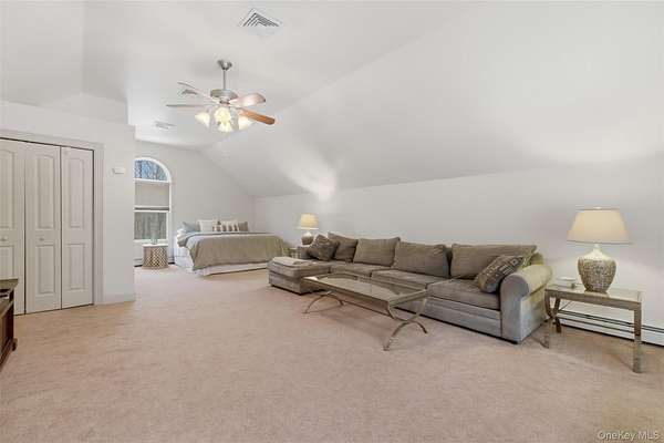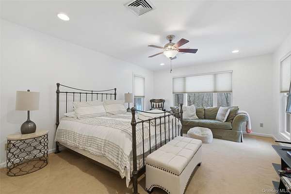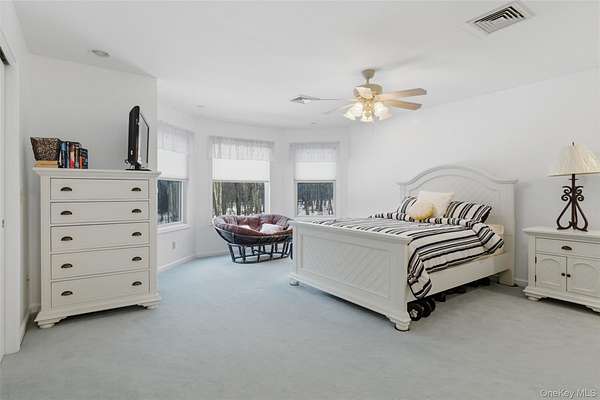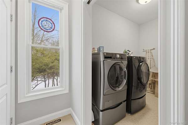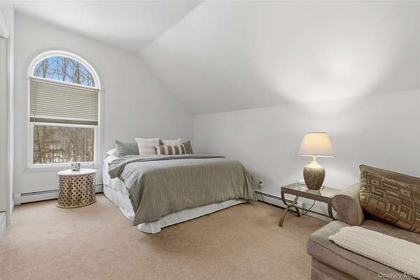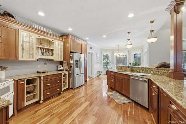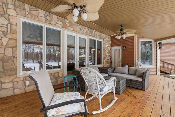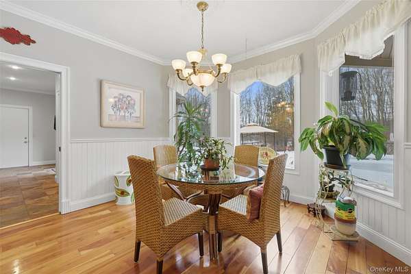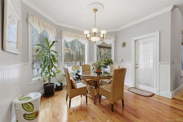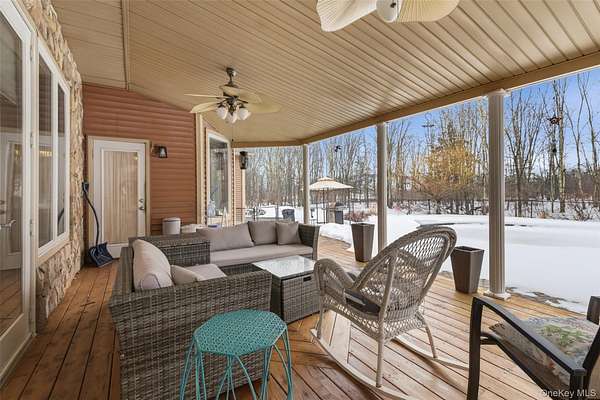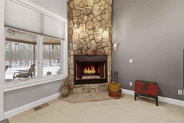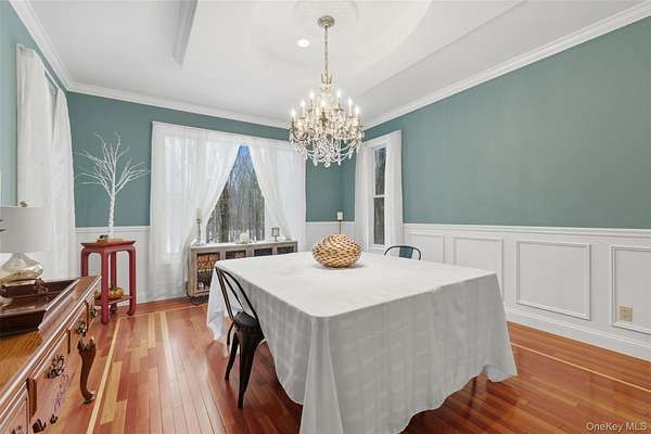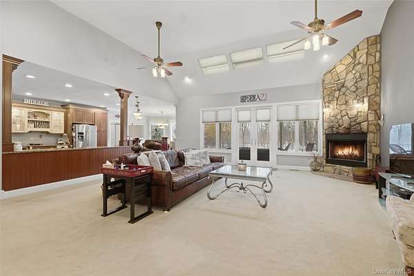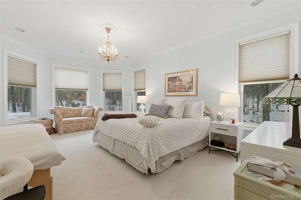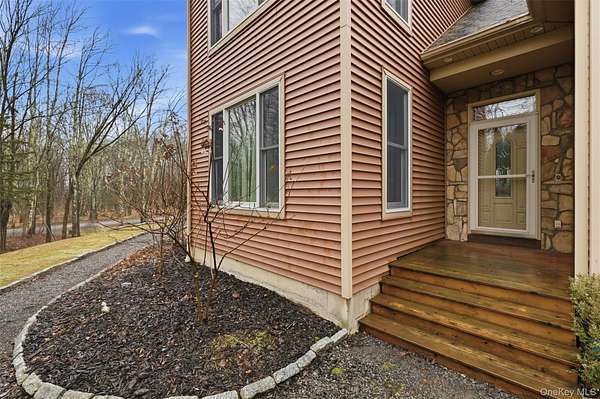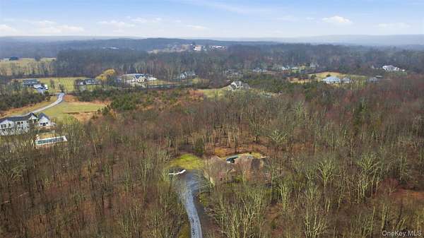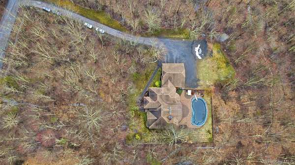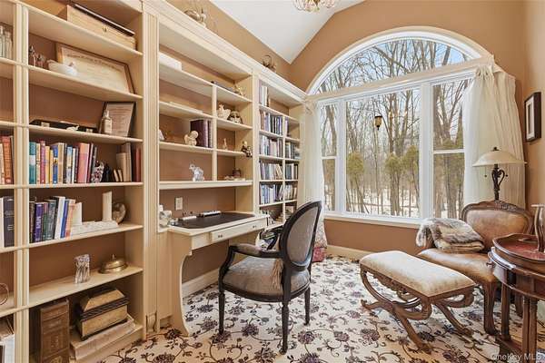 Welcome to this exceptional 4-bedroom, 5-bath luxury residence offering 3,654 square feet of refined living space on 5.3 private acres. Designed with both elegance and functionality in mind, this home features an expansive open floor plan with soaring 17-foot ceilings and Brazilian cherry wood floors throughout the main living areas. The grand entry opens to a dramatic living room and chef's kitchen, seamlessly connected for effortless entertaining. Double glass doors lead to a beautifully designed terrace and in-ground kidney-shaped pool, creating the perfect indoor-outdoor lifestyle. The main level includes a formal dining room with decorative ceiling detail, a private library, and a spacious first-floor primary suite complete with terrace access, a full bath, and walk-in closet. A private office with separate entrance and pocket doors allows for a quiet work-from-home setup. This separate entrance also connects to an additional bedroom and full bath, ideal for guest quarters or extended living arrangements. Upstairs, each additional bedroom features its own private full bath and walk-in closet, providing comfort and privacy for all. Additional highlights include a two-car garage, full unfinished basement with potential for expansion, and meticulous upkeep throughout. A rare opportunity to own a thoughtfully designed luxury home offering privacy, space, and versatility.