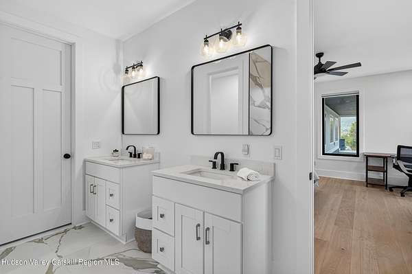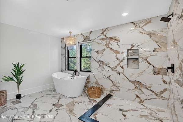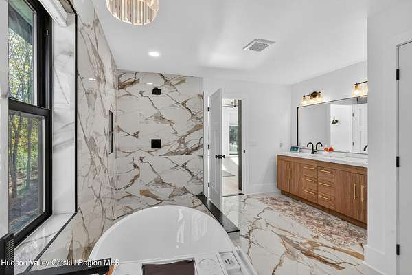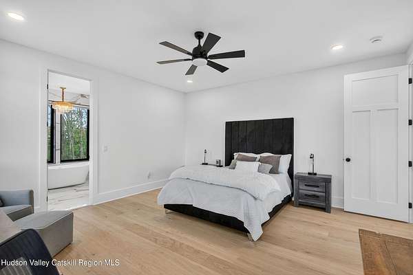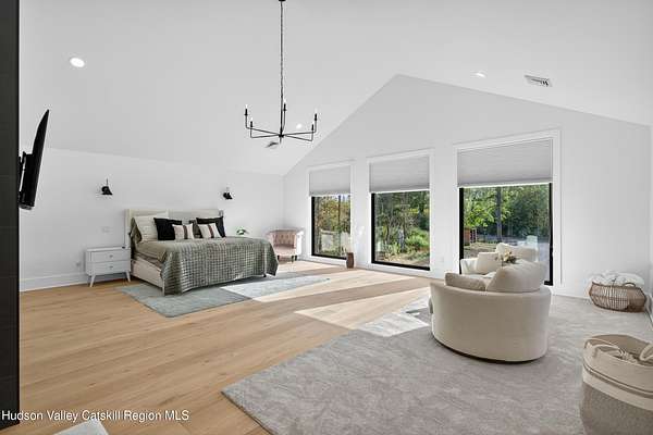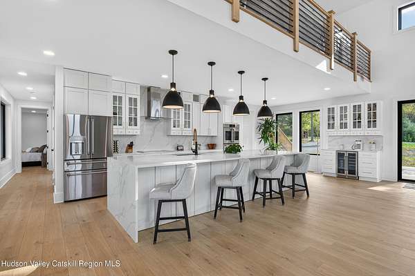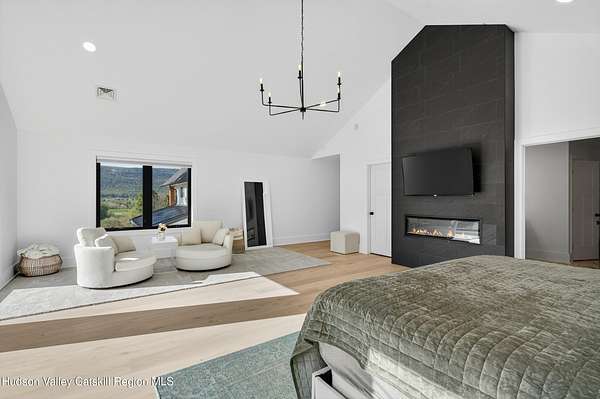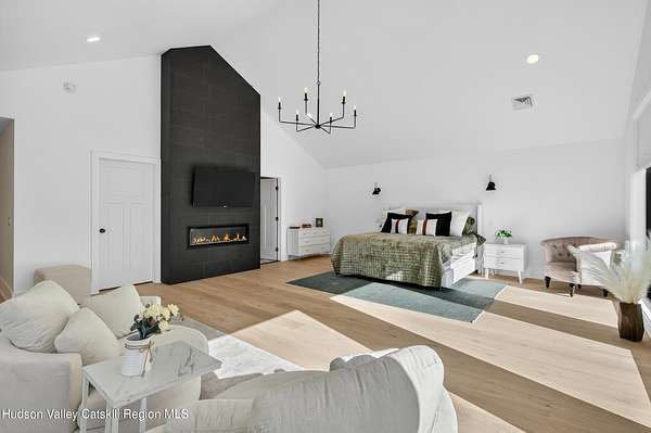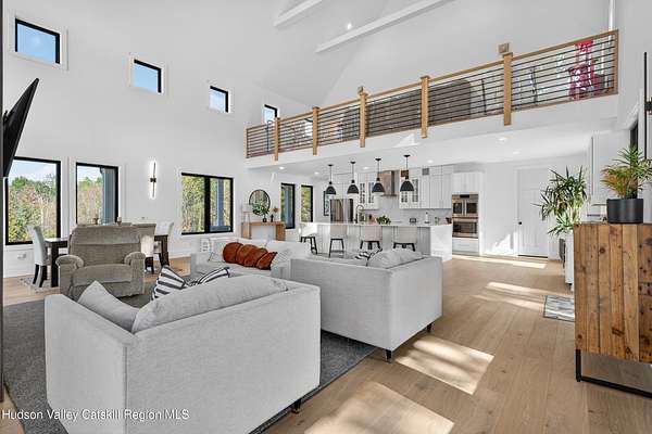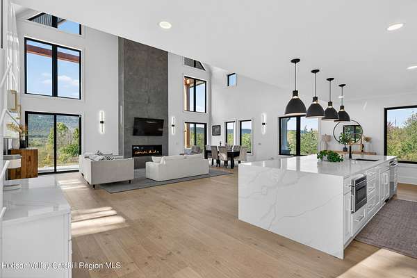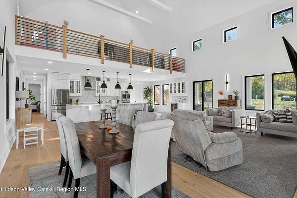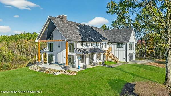 Nestled on a peaceful road with breathtaking views of the Shawangunk Ridge and Mohonk Tower, this stunning modern farmhouse offers 4,862 square feet of sophisticated living space across five bedrooms and four and a half bathrooms. The heart of this home is the magnificent great room, featuring soaring 36-foot ceilings and a propane fireplace that perfectly frames the spectacular mountain panorama beyond. The chef's kitchen is a culinary dream, showcasing cafe-grade appliances, gleaming quartz countertops, and a generous island that invites both casual meals and elaborate entertaining. The thoughtful open floor plan seamlessly connects living spaces while maintaining distinct areas for relaxation and gathering. The first floor primary suite provides a luxurious retreat with a soaking tub, double vanity, and spacious walk-in closet. Also conveniently located on the main level are the laundry room, home gym, and powder room. Upstairs, a dramatic loft overlooks the great room below, while a full bathroom serves the Jack and Jill bedrooms, each with separate vanity areas. The show-stopping upstairs primary bedroom boasts vaulted cathedral ceilings, panoramic mountain views, a cozy electric fireplace, and an extravagant bathroom featuring beautiful tilework and a soaking tub that gazes into private woods. Additionally upstairs features a spacious home office with its own entrance - perfect for remote work or creative pursuits. This exceptional location provides easy access to outdoor adventures at Minnewaska State Park Preserve, local wineries, and the charming nearby towns of New Paltz and Gardiner. Whether you're hiking, climbing, biking, or exploring farmers' markets, endless recreation awaits. Plus, commuting to New York City remains surprisingly convenient, making this the perfect blend of mountain tranquility and urban accessibility.
