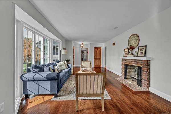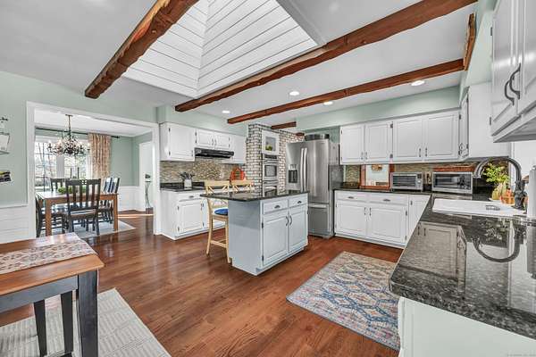 The perfect balance of elegance, comfort, & design, this 2,600 sq ft ranch in a sought-after Brookfield neighborhood was created for those who love to gather and entertain. Every space invites relaxation and connection; from the sunlit living room with its brick fireplace and bay window, to the open dining area that flows seamlessly into the heart of the home: a character-filled kitchen with exposed beams, brick accents, skylight, and center island seating. An expansive great room extends from the kitchen, framed by a wall of windows and sliders that open to the pool and patio. With its pellet stove and built-in bar, this space captures the essence of effortless entertaining. A second family room with a cozy brick fireplace provides a more intimate setting for quiet mornings or winter nights by the fire. The private bedroom wing features three spacious rooms, including a primary suite with walk-in closet and en suite bath. A separate fourth bedroom/guest wing with full bath and laundry offers flexibility for an au pair, in-law, or work-from-home space. The full basement provides exceptional storage and endless possibilities for future expansion or recreation. Outdoors, the resort-style backyard is a retreat all on its own, complete with an inground gunite pool, stamped-concrete patio, firepit, and generous yard for gathering and play. Located just moments to I-84, schools, shopping, and all the conveniences of Brookfield living.