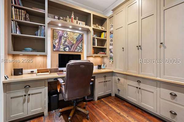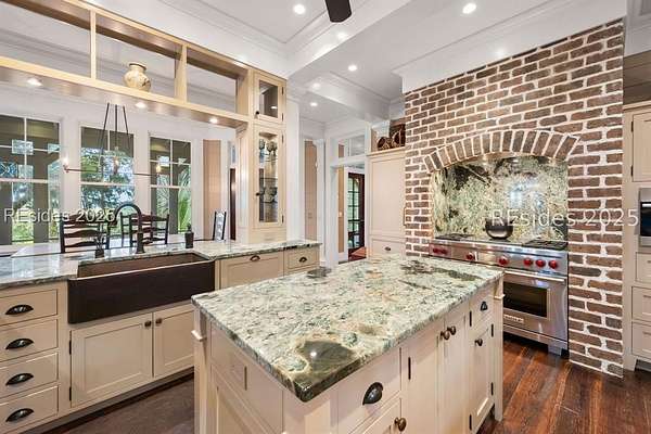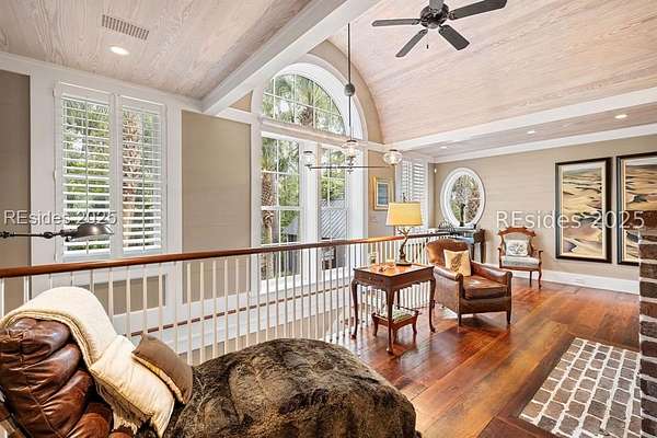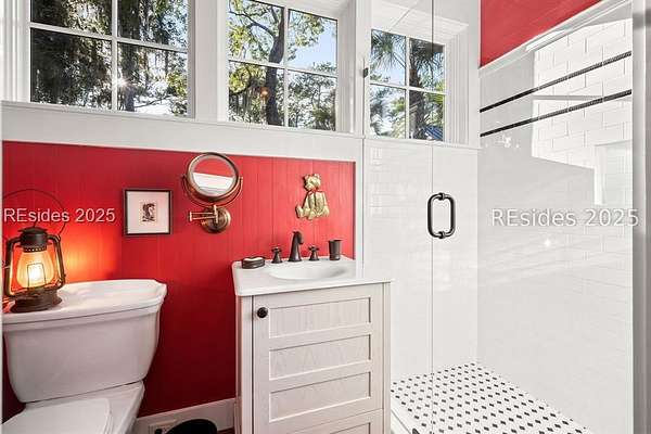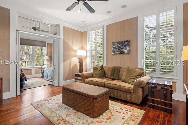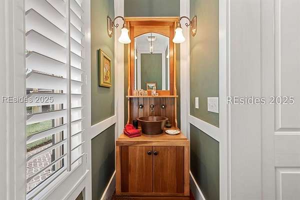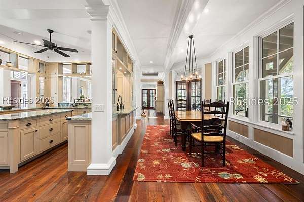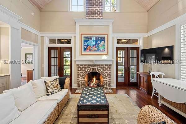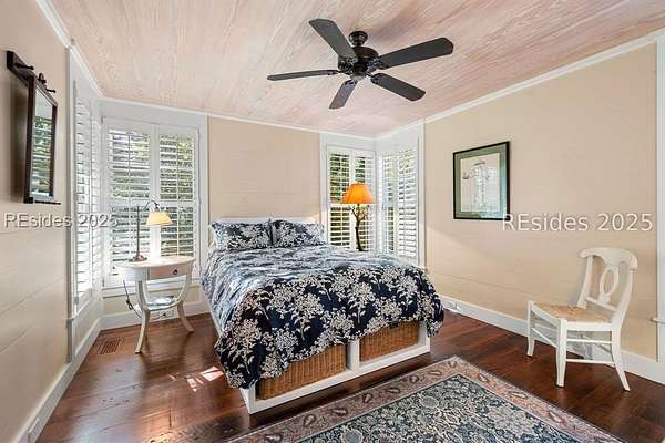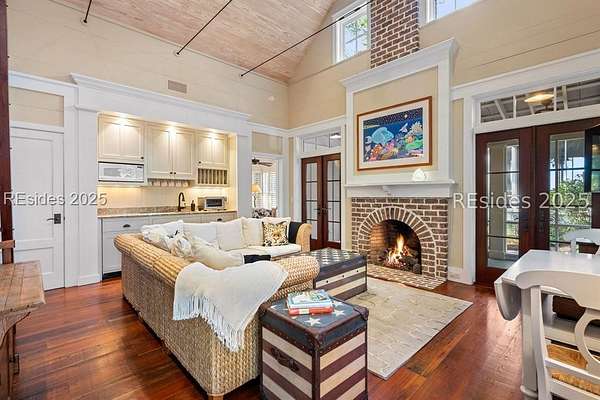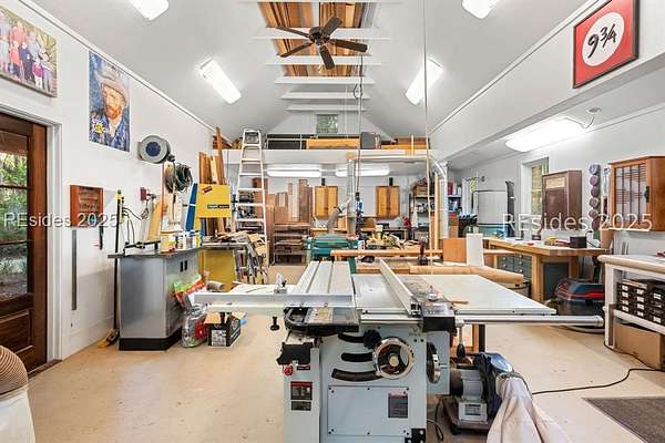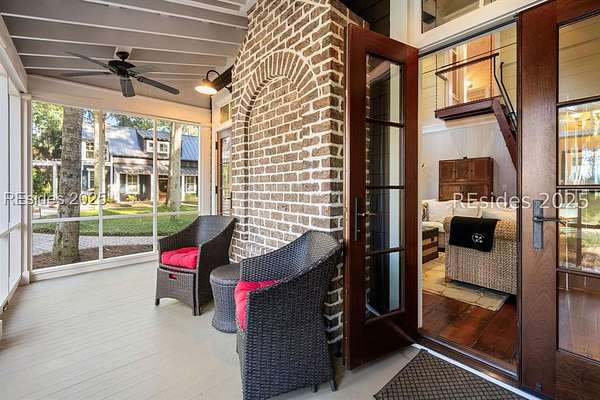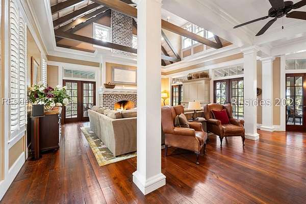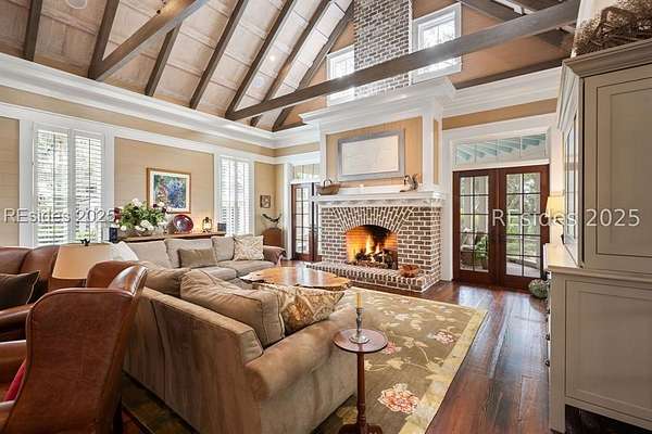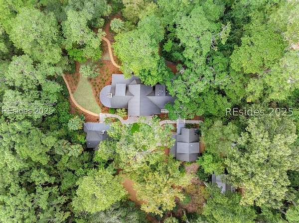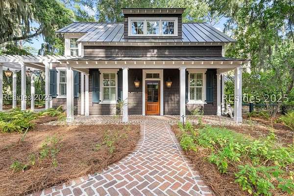 Exquisite sunsets over Callawassie Creek and the Colleton River provide a breathtaking backdrop for this rare Nantucket-style family compound on coveted Spring Island. Sited on 3.5+ acres, this 5,223 sq. ft., 5BR/5.5BA waterfront estate includes a private tidal dock with direct access to Callawassie Creek, the Colleton River, and the Atlantic Ocean. By boat, enjoy easy day trips to Hilton Head, Savannah, or Beaufort, or simply relax at home while fishing, crabbing, shrimping, or watching dolphins and Roseate Spoonbills from your backyard sanctuary. The 3,249 sq. ft. main residence (2BR/2.5BA) was designed for year-round living, showcasing an open floor plan, chef's kitchen, and porches that span the length of the home. The east wing features an apsidal screened porch with Savannah brick fireplace, ideal for Lowcountry outdoor living. The entire second floor is dedicated to a private owner's retreat, complete with sitting room and fireplace, screened porch, spa-like bath with freestanding tub and oversized shower, a large custom walk-in closet, and abundant finished storage. A 995 sq. ft. guest house (2BR/2BA) offers its own living room with fireplace, kitchenette with full-size appliances, washer/dryer, children's loft with built-in bunks, and screened porch overlooking the river. The detached two-car garage with golf cart bay includes a 482 sq. ft. carriage house, perfect for additional guest quarters, studio, or office along with a professional-grade darkroom. A freestanding 764 sq. ft. workshop provides a creative haven, currently outfitted as a professional woodworking studio with exceptional equipment (available separately), but equally suited as an artist's studio. Life on Spring Island is unlike anywhere else, with 3,000 acres of preserved natural beauty and premier amenities: an Arnold Palmer-designed golf course, equestrian center, tennis and pickleball, state-of-the-art fitness complex with heated and chilled saltwater pools, miles of scenic trails, a 7.5-acre farm, and an inspiring art barn. Blending timeless design, craftsmanship, and an extraordinary setting, this rare compound offers the ultimate in Lowcountry luxury, an unparalleled opportunity for multi-generational living on Spring Island.