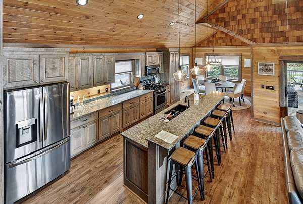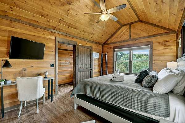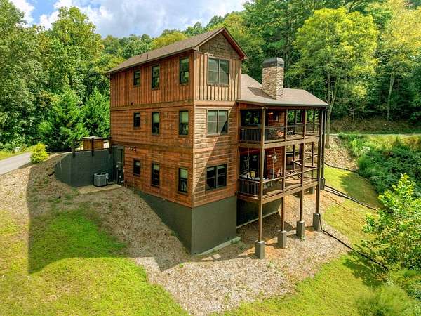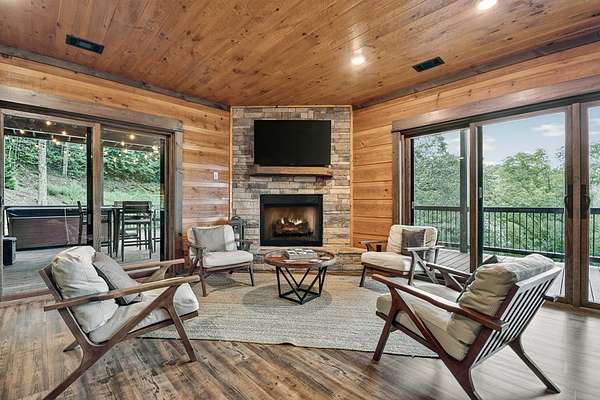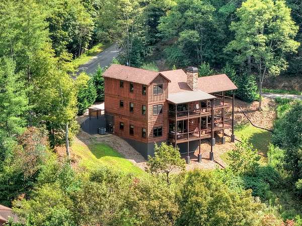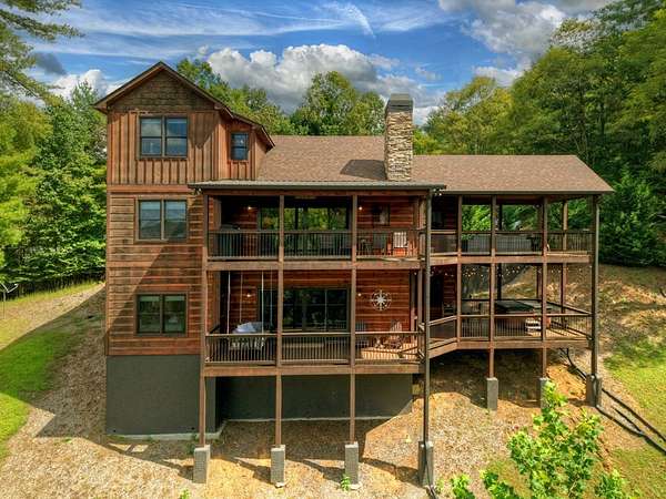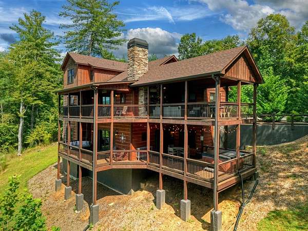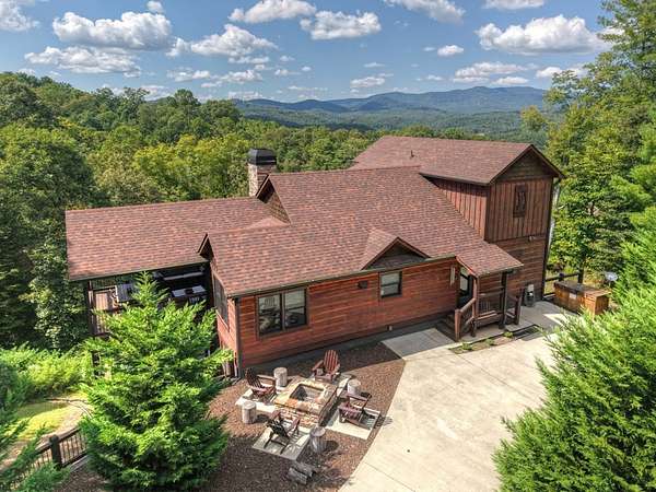 RENTAL REVENUE ESTIMATED APPROX. $150k! Perched on a private ridge with breathtaking long-range views stretching across three states, Painted Sunset Lodge combines rustic charm with modern luxury. With all-paved access just minutes from Downtown Blue Ridge, this remarkable four-bedroom, three full bath, and two powder room retreat is designed for both relaxation and entertaining. The main level offers an airy open-concept living area, anchored by a stone fireplace and framed by expansive windows that showcase dramatic mountain sunsets. A gourmet kitchen with generous counter space and premium finishes flows seamlessly into the dining and living areas, while sliding doors open to a covered deck complete with fireplace, dining space, and lounge seating—all overlooking sweeping vistas. Three private king suites provide comfort and privacy, each with a well-appointed bath, while a fourth bunk room is ideal for family or guests. Across two spacious levels, multiple gathering spaces include a second living room and a terrace-level den with its own fireplace, full wet bar, and game area. Distinctive finishes—warm wood interiors, soaring ceilings, and thoughtful details—enhance the home's mountain lodge character. Outdoor living is equally compelling, with multiple decks, a hot tub, a swinging bed, and an easy-access fire pit perfect for evenings under the stars. Whether as a full-time residence, vacation retreat, or investment property, Painted Sunset Lodge offers unmatched views, rustic elegance, and convenient access to the best of North Georgia.