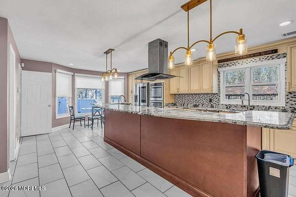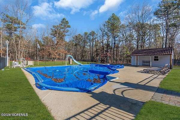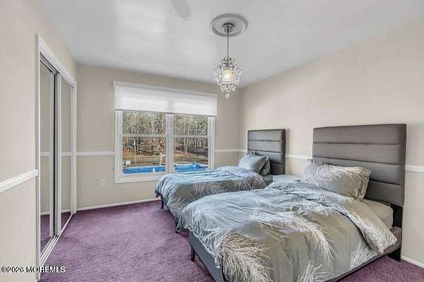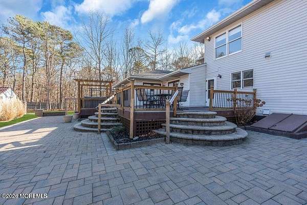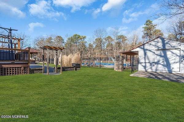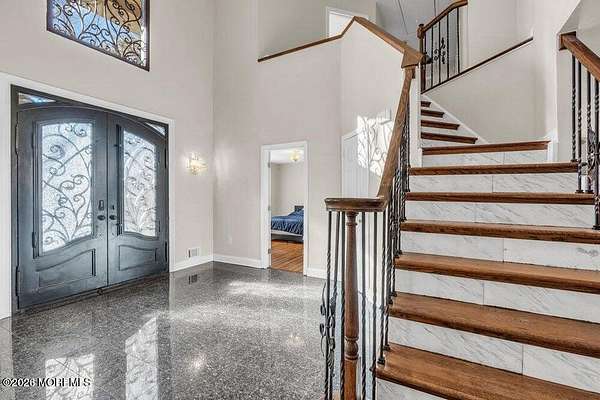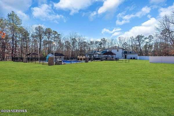 Exceptional 4BR, 2.5BA home offering approx. 3,200 sq ft of elegant living space. Enter through wrought-iron doors into a grand two-story foyer with marble floors and crystal chandelier. Features include a spacious living room with wood-burning fireplace, family room, and formal dining room. Gourmet kitchen boasts a 15-ft island, wet bar, walk-in pantry, and butler's kitchen/laundry combo. First-floor primary suite with dual California closets and en-suite bath. Upstairs offers a junior suite, two additional bedrooms, and full bath. Finished walkout basement with wet bar and home theater. Backyard oasis with deck, hot tub, paver patio, outdoor kitchen, and inground pool.