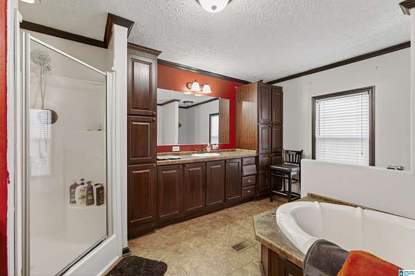 - Garden Tub, Jetted Tub, Separate Shower, Separate Vanities, Tub/Shower Combo, Walk-In Closets