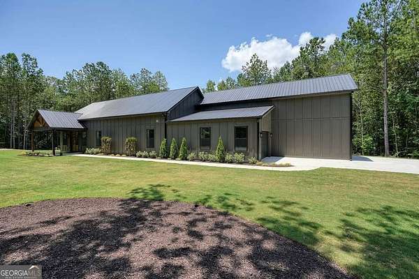 This barndominium sits on 3.71 level acres in a peaceful, lightly developed area surrounded by estate-sized properties, offering a beautiful flat lot bordered by mature hardwoods with excellent privacy and no HOA, with development including minimum deed restrictions only. The single-level layout features open-concept living with recessed lighting and durable laminate flooring, anchored by a stunning living area with a vaulted stained tongue-and-groove ceiling, a ventless gas fireplace, and a large sliding glass door that fills the space with natural light and provides easy outdoor access. The kitchen offers white cabinetry, solid-surface countertops, a large island, and a walk-in pantry, and the entry is highlighted by a large double front door that brightens the main living space and enhances the welcoming feel of the home. The primary suite features a tiled walk-in shower with a full-length bench, double vanity, generous closet space, and its own large sliding glass door for added light and direct outdoor access. Two additional bedrooms share a Jack-and-Jill bathroom with extra cabinetry, and a spacious main-level laundry room offers a utility sink and ample storage. The oversized attached garage accommodates an RV or motorhome with its 12x16 door, 37-foot depth, and prewired RV plug, while a separate side-entry 1-car garage with opener adds additional parking or workshop flexibility. Outdoor features include a covered front porch, multiple detached sheds for storage, and a concrete patio near the front porch, along with a nicely landscaped yard offering plenty of usable space for gardening, play areas, or future expansion. The property has access to high-speed internet and is conveniently located between Jasper and Ellijay, providing easy access to shopping, dining, and outdoor recreation.