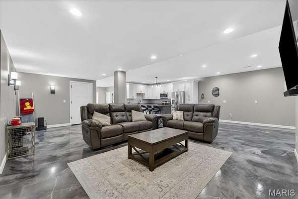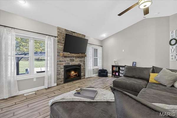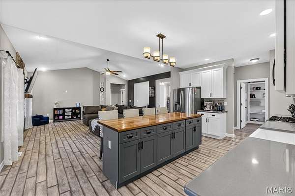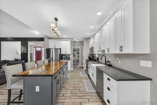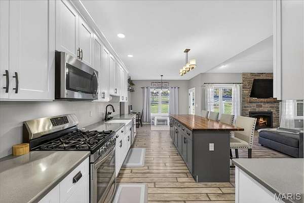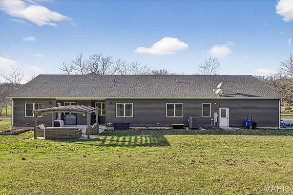 Welcome home to this custom-built 10-year-old ranch on 3 private acres backing to trees and open farmland. The home is situated on a unique side walk-out lot with two patios and a firepit. The oversized side-entry 3-car garage offers 1,270 sq. ft. plus an additional 154 sq. ft. of storage. Inside you are greeted with an open-concept floorplan with vaulted ceilings, LVP flooring and a stone, gas fireplace with wood mantle. The chef's kitchen features custom cabinetry, quartz countertops, an oversized island with butcher-block top and breakfast room. Off the kitchen is a private office with built-ins and a formal dining. A split-bedroom design provides privacy, with a spacious primary suite with vaulted ceilings, patio access and a spa-style bath with clawfoot whirlpool tub, double vanity, tiled shower and walk-in closet with built-ins. Two additional bedrooms with walk-in closets, a full bathroom, powder room and a laundry room/mudroom complete the main level. A professionally finished basement includes a full second living space designed to mirror the main level, complete with another chef's kitchen featuring custom cabinetry, refrigerator, stove, microwave, dishwasher and large butcher-block island. The lower level also includes a spacious rec area with concrete floors, a 4th bedroom, 3rd full bath, walkout access and additional room for storage. Whether you're looking for multi-generational living or simply a private retreat with plenty of space, this home has it all.