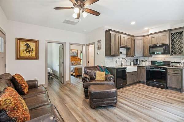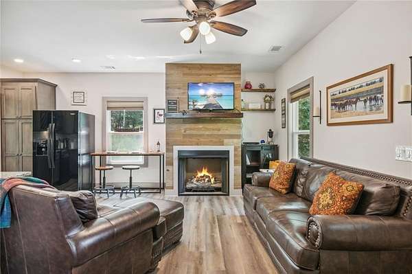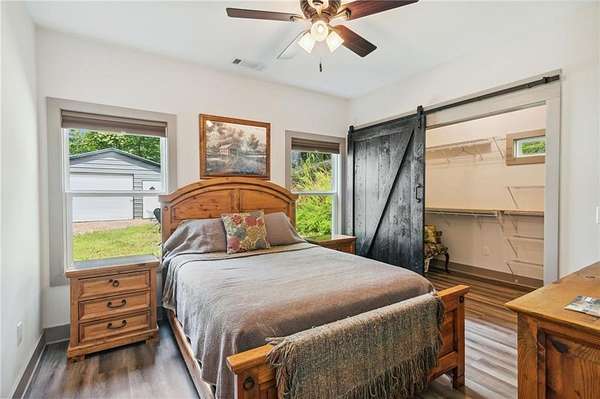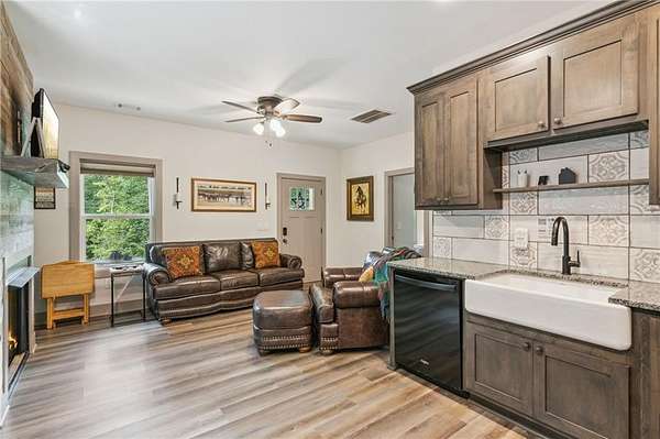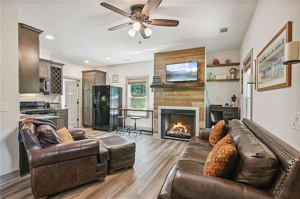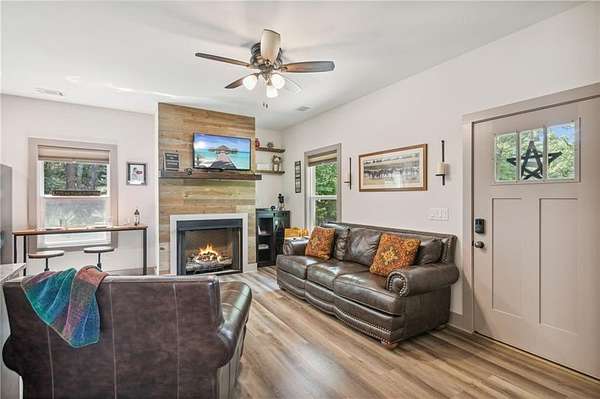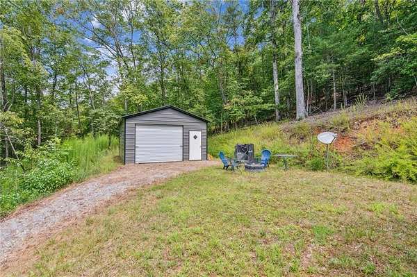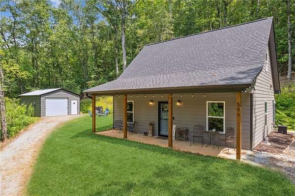 Tucked away in the North GA Mountains, this private 3 acre retreat offers 185 feet of frontage on the beautiful Chestatee River. Enjoy the peaceful setting from the covered front porch with your morning coffee while watching the wildlife, or unwind down by the river listening to the shoals, swimming, floating, or fishing for trout. Evenings are perfect for relaxing on the deck or gathering around the outdoor fire pit for s'mores. The home features an open floor plan with luxury vinyl plank flooring throughout, 2 bedrooms and 1 bath with a walk in shower. The main bedroom includes a large walk in closet. The kitchen offers stained cabinets, granite countertops, and a built in wine rack. There is also a laundry/mudroom with an exterior entrance and a living room with a fireplace and gas logs. The home is wired for a generator. An 18x26 metal building provides space for a garage or workshop. The property already has a well and septic in place, ready for a second home to be built and offers a hard to find gently sloping, private homesite closer to the river. Build your dream home on the river while keeping the existing cottage as a rental or guest house for additional income. This property is ideal as a vacation rental, full-time rental, or primary residence. Located just 15 minutes from Dahlonega Square with shopping and restaurants, and only minutes to Frogtown Cellars, Three Sisters Vineyards, Kaya Vineyard and Winery, and Big Creek Distilling Company, with many more wineries nearby. No HOA or restrictions. Don't miss this incredible opportunity on the Chestatee River!