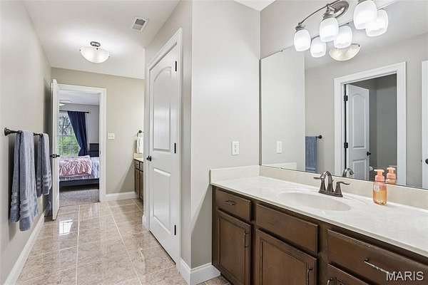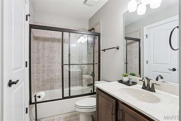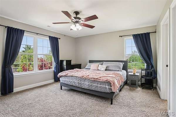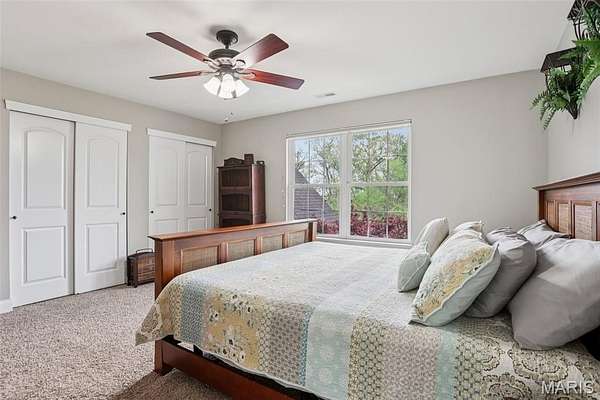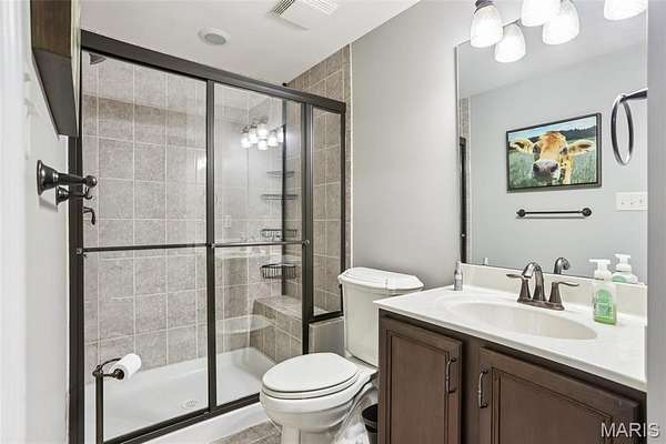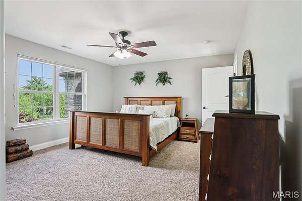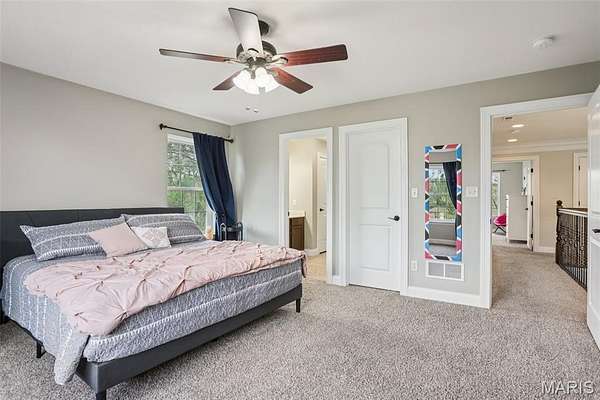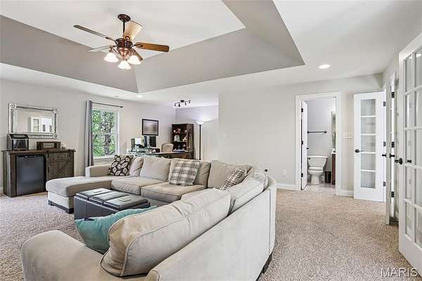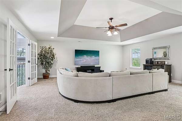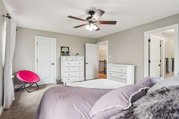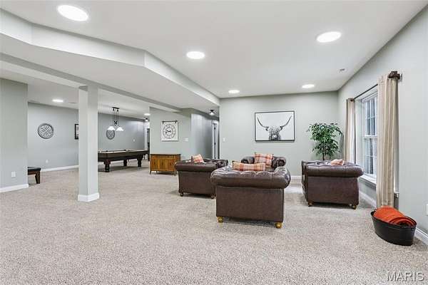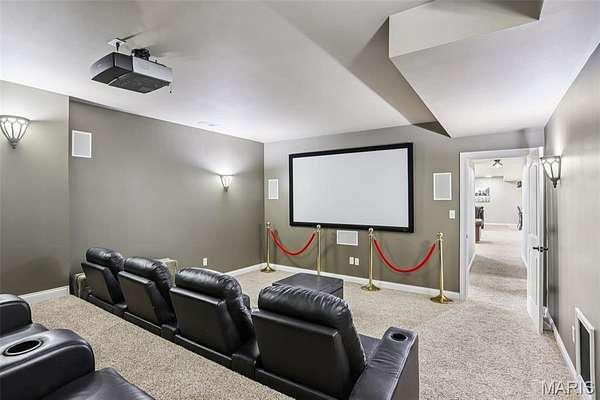 Upstairs, bedrooms 2 & 3 share a bath with double vanities, offering both comfort and functionality, while bedroom 4 enjoys easy access to a hall bath—ideal for guests or family. A spacious upper-level family room with French doors and a Juliet balcony overlooks the great room below, creating an open, connected feel perfect for everyday living or entertaining. The finished walk-out lower level expands your living space with a rec rm featuring a bar, dedicated theater room for movie nights, a private 5th bedroom, and full bath—perfect for guests, multigenerational living, or a private retreat. Thoughtful updates include new paint (2020), garage doors/openers (2021), humidifier (2023), deck (2023), and architectural roof with gutter guards (2024), 220 Outlet to exterior, Double Oven and some lighting.