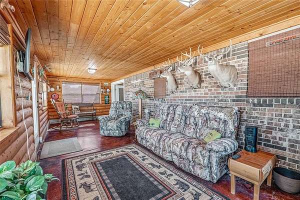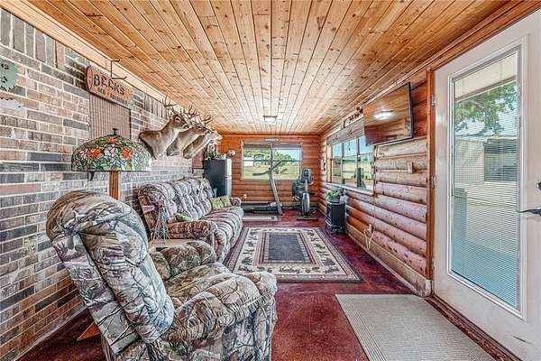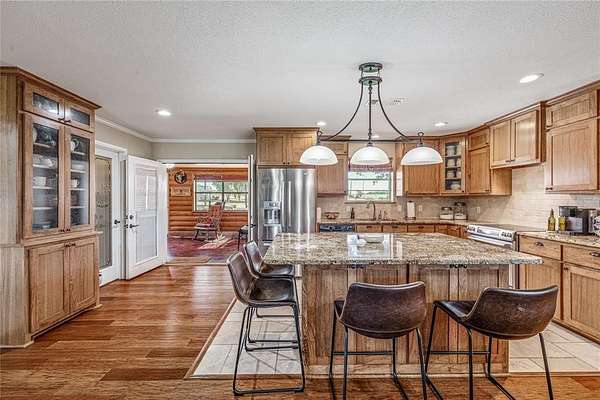 Inside this home features over 2500 square feet of living space. The open living area centers around a cozy fireplace, creating a warm and inviting atmosphere. The kitchen is a standout with a large island, custom wood cabinetry, granite countertops, and a walk-in pantry—ideal for cooking and gathering. The log-accented sunroom adds rustic character and serves as a bright, relaxing space to enjoy year-round.