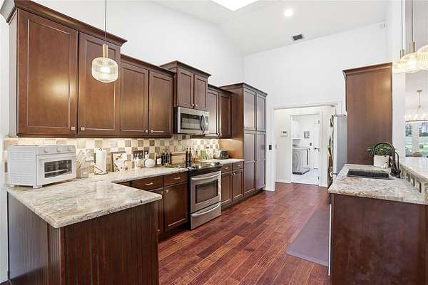 The open-concept layout connects the updated kitchen, family room, dining area, and breakfast nook, making everyday living and entertaining effortless. In 2023, all carpet in the secondary bedrooms was removed and replaced with laminate wood flooring that flows seamlessly into the engineered hardwood flooring in the dining and family rooms. A full-home water filtration and softener system with reverse osmosis was also added in 2023.