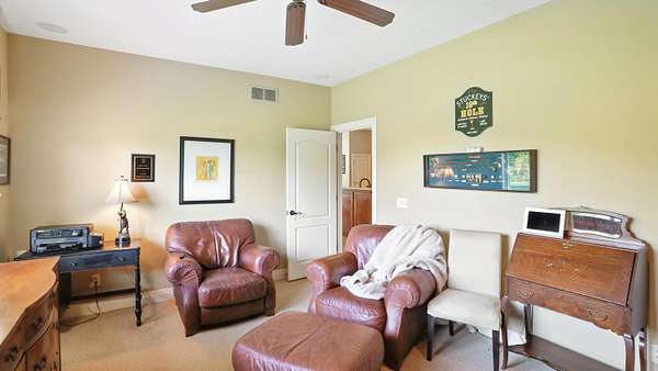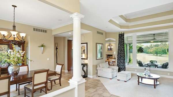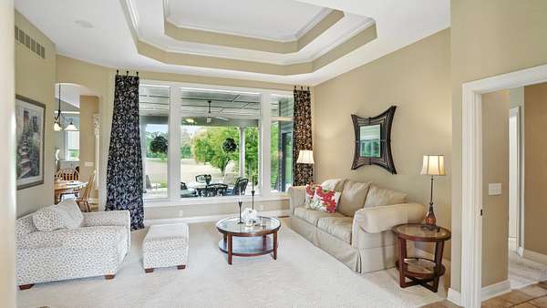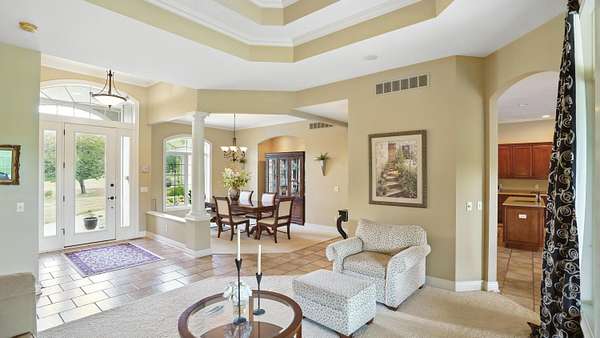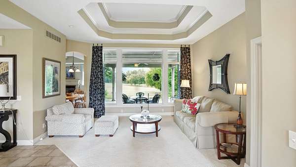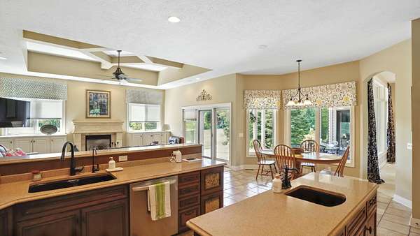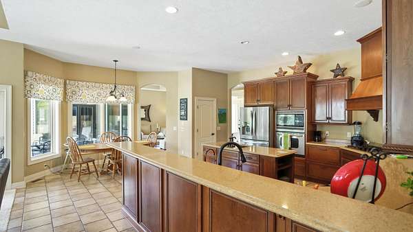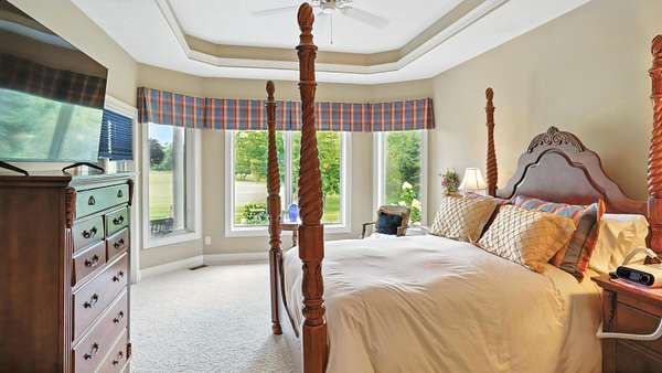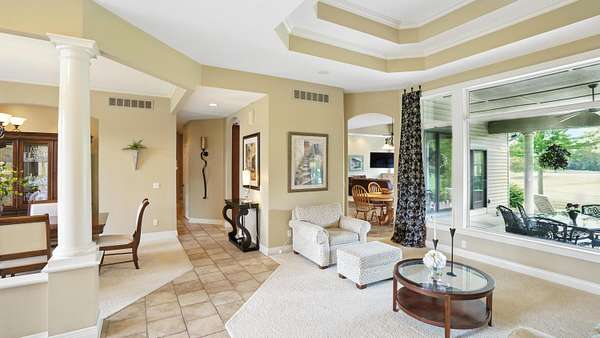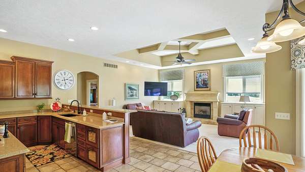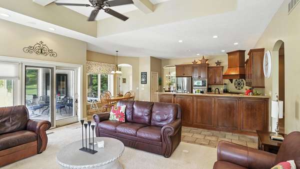 Welcome to this stunning one-story home by Bob Buescher Homes, located on the Bella Vista Golf Course in Coldwater, Michigan. Built in 2005 and well maintained, the property sits on over an acre, including an extra buildable lot with maturing fruit trees. The sitting room features a large window overlooking the first fairway, where you can watch wildlife among the apple and other fruit trees. Inside, there are three bedrooms on the main leveltwo with private bathrooms, and a third that shares a full bath with the office and guests. The primary suite offers broad views of the fairway and direct access to the back patio. The open kitchen flows into the living area and out to the patio through sliding glass doors, creating an ideal space for entertaining and indoor-outdoor living. The finished basement includes a full bedroom and bathroom, plus basically a full kitchen, providing extra living space for guests or extended stays. Additional features include a three-car garage, central vacuum system, reverse osmosis water filtration, two wells (irrigation and household), and main level laundry. Bella Vista Golf Course is an 18-hole course known for its natural setting and wildlife. The pro shop and restaurant are just a quick golf cart ride away. The course sits just off Coldwater Lake, with some water views from the fairways. This property can be paired with a separate parcel that includes shared, deeded pier access to Coldwater Lake, shared among three families. There's plenty of outdoor space with golf course views and room to grow.