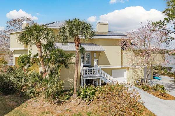 Welcome to 600 Soundview Drive, the ultimate boatable waterfront retreat offering unparalleled views of Southerland Bayou at the mouth of the Intracoastal Waterway. Perfectly positioned in the highly sought-after Ozona community, this exceptional residence rests on a quiet cul-de-sac, providing both privacy and breathtaking panoramic water vistas. This stunning Key West-style home makes an unforgettable first impression with its charming white and yellow facade and eco-friendly solar power. Ascend to the elevated main level where endless water views immediately captivate. The expansive open-concept living area features soaring two-story ceilings and a cozy wood-burning fireplace. The rear of the home offers 180-degree water views and opens onto a wraparound covered. Below, enjoy a sparkling pool and lanai and private dock and covered boat lift. With deep, boatable water, this property is truly a boater's paradise. Back inside, the main level is designed for entertaining. A spacious bar area flows into the oversized kitchen, complete with granite countertops, stainless steel appliances, custom wood cabinetry with decorative trim, and a breakfast bar overlooking the breathtaking views. Adjacent is a grand formal dining room featuring intricate ceiling detailing and sweeping water vistas. An additional office/bedroom/in-law suite includes built-in bookshelves and an attached half bath with potential to convert to a full bath. A closet pantry, separate laundry room with garage access, and an electric dumbwaiter add convenience and functionality. On the opposite wing, two generously sized guest bedrooms offer sliding door access to the lanai and share a Jack-and-Jill bathroom with dual vanities and granite countertops. An additional guest bath completes the level.