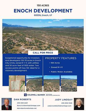 ''Great Opportunity for ''Investors/Developers''! *150.78 Acres *Zoned R-1-11 *Enoch City Limits * All Utilities Available *Includes 30 ac ft of 1930 water already in Enoch's Public Water System *2 Access Points off Hwy 130 *Can do ''Master Plan Community''!