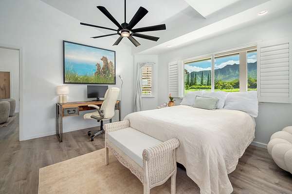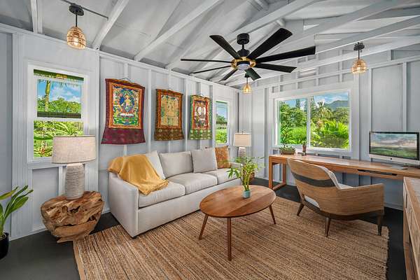 If you're looking for a view property with generous acreage for farming pursuits, while staying just minutes from world-class beaches and the charm of Kilauea town, this North Shore estate may check all your boxes. Nestled at the base of Mt. Namahana, this nearly 9-acre farmhouse gated estate offers sweeping mountain views and a true country-living experience. The beautifully maintained main residence features 3 bedrooms, 2 baths, plus a bonus room ideal as a 4th bedroom. Interior details include vaulted ceilings, granite countertops, DeWils solid oak cabinetry, and a cast-iron wood-burning fireplace perfect for cool winter evenings. A detached office cottage provides added flexibility for work, guests, or creative space. A spacious wraparound lanai invites relaxed outdoor living with panoramic views of the surrounding mountains and pastureland. The property is fully fenced, with approximately seven acres of usable, level pasture-ideal for farming, ranching, or grazing animals. In the back corner of the property, a small stream runs through, offering a true sense of nature. There is also potential for a guest house and additional accessory buildings (buyers or buyer's broker to confirm details with the listing agent and County agencies). The land is abundant with fruit trees, including Mango, Orange, Tangerine, Lemon, Grapefruit, Red and Yellow Guava, Mountain Apple, Sour Sop, Avocado, Papaya, and Macadamia. Plus flowering plants that include : Birds of Paradise, Ginger, Gardenia , and Hibiscus. Located in the desirable Kalihiwai Ridge community, this peaceful retreat is just minutes from Kilauea, Princeville, Hanalei, and Kauai's most beloved beaches. Whether you envision growing your own food or a private estate, this property offers exceptional opportunity in one of the North Shore's most desirable settings.