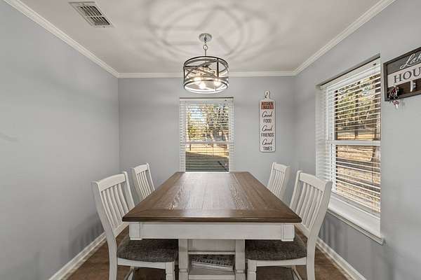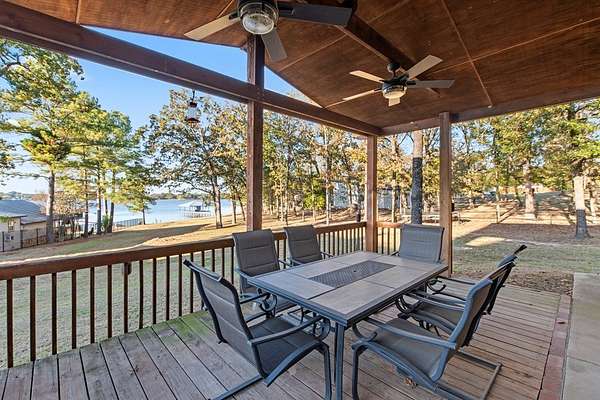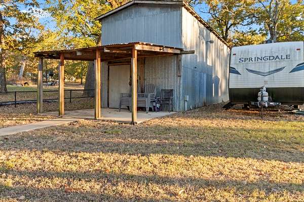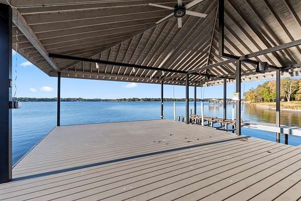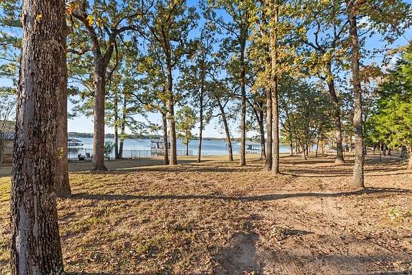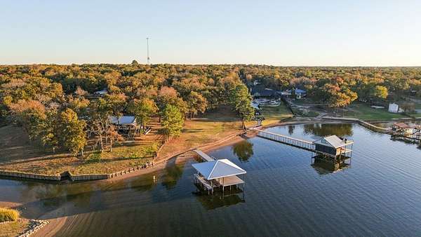 Cozy lake cottage on 3.4 acres with nearly 200 ft of waterfront, great water depth, and a brand-new top-of-the-line boathouse! Charming 1,104 sq. ft. home ideal as a weekend getaway or a place to stay while building your dream Lakehouse. The existing residence can easily become a future guest house for family and friends. Sellers have custom 5,531 sq. ft., 5 bed, 6.5 bath, 3-car garage house plans already drawn up for the property, and they're included in the list price--making it even easier to bring your vision to life. The property is fully fenced with a gated entry and offers lots of buildable land surrounded by mature trees for privacy and space. No known restrictions--so there's potential for multiple homes (with county permit for septic system(s), livestock, or even short-term rentals. Inside, the home has been freshly painted for a bright, light, and inviting feel. The living area features a wood-burning fireplace and large picture window overlooking the property and open water. The home's elevated position provides beautiful lake views from both the living room and kitchen. The kitchen includes granite countertops, stainless appliances, newer-style cabinets, crown molding throughout, and tile floors (no carpet). A huge covered deck extends the living space outdoors--ideal for relaxing or entertaining. Outbuildings include a large RV-boat barn that can accommodate multiple vehicles, a two-bay metal barn with enclosed shed area, plus two tool sheds. Plenty of room to add a large metal building, livestock barn, or barndominium! Livestock allowed per acre within Henderson County restrictions. The new boathouse is a showstopper--built with all-aluminum decking that's low-maintenance, cool to the touch on hot days, and never needs staining or painting. It includes a wide walkway, boat and jet ski lifts, and a massive covered seating area perfect for lakeside gatherings. A rare waterfront find offering acreage, great water depth, and upgraded boathouse.