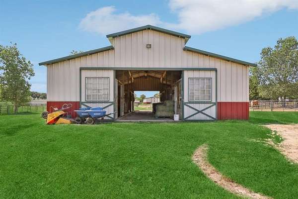 Welcome to Your Texas Equestrian Retreat! Nestled in the highly desirable Double Oak community with a Flower Mound address, this 9.7-acre horse ranch offers the perfect balance of wide-open space, exceptional equestrian amenities, and convenient proximity to everything North Texas has to offer. Whether you're a dedicated horse enthusiast, a competitive rider, or simply someone who craves the serenity of country living without sacrificing city conveniences, this property is an opportunity unlike any other. The home blends comfort and function, with inviting living spaces anchored by a floor-to-ceiling stone fireplace, a flexible office, and a primary suite complete with a jetted tub and dual closets. Outdoors, a sparkling pool invites you to relax after a day in the saddle, while a heated and cooled attic offers abundant storage. But the true heart of this property lies in its equestrian infrastructure. Four well-designed barns provide stalls, tack rooms, and storage for every need, while the lighted arena, electric horse walker, and loafing sheds in every pasture ensure year-round training and care. With water lines along all fencing, this ranch was built to make managing your horses as effortless as it is enjoyable. Only one acre of the property is residential use with the remainder holding an agricultural exemption for low taxes. It's also currently income producing with hay. Here, you'll find more than just a home -- you'll find a lifestyle. Mornings begin with golden sunrises over lush pastures, afternoons are filled with the rhythm of hooves, and evenings end under the soft glow of arena lights or the warmth of the poolside breeze. There is even room to build more homes for a family compound! If you've been searching for a property that offers the freedom of rural living, the functionality of professional-grade facilities, and a location that keeps you close to everything, welcome home.