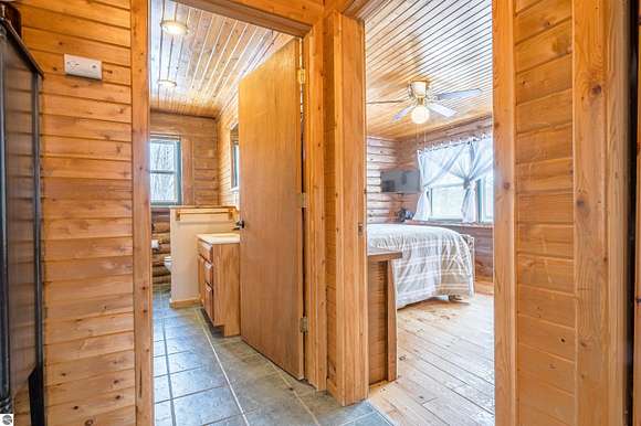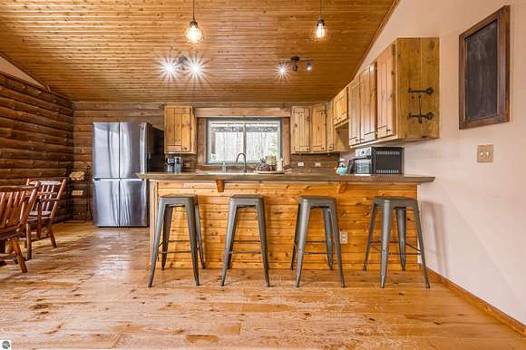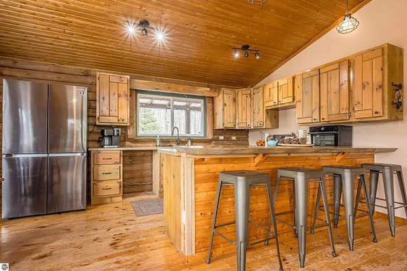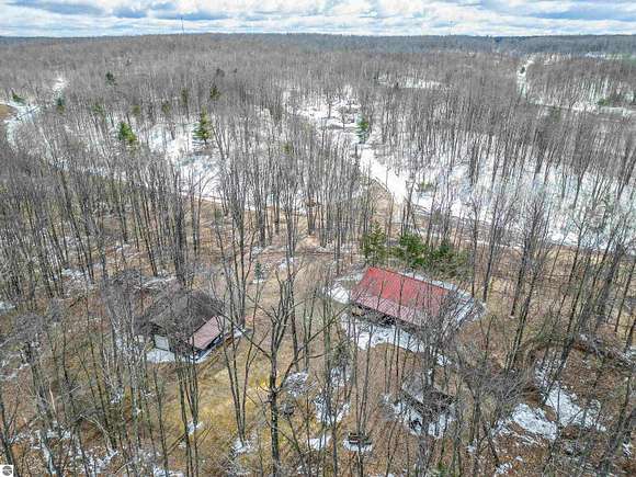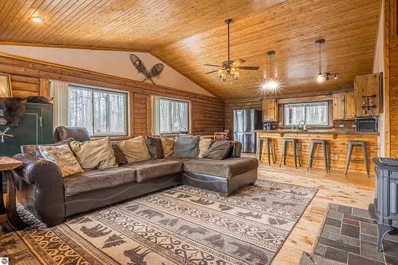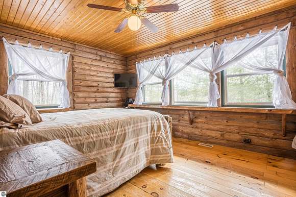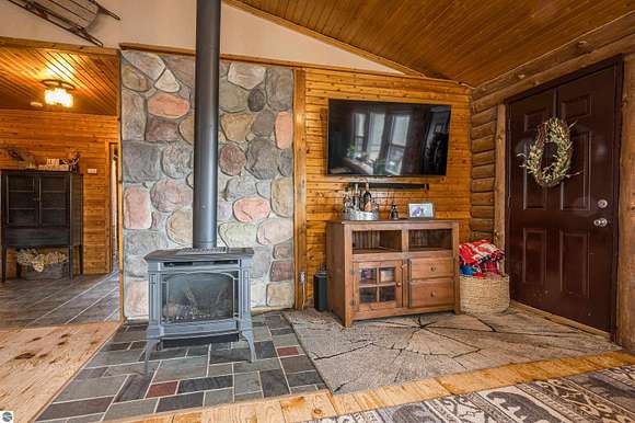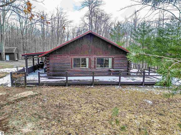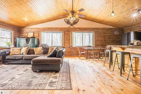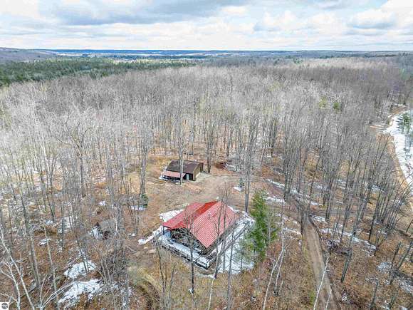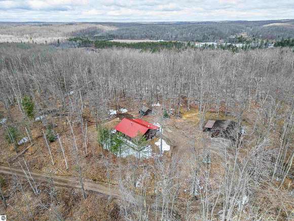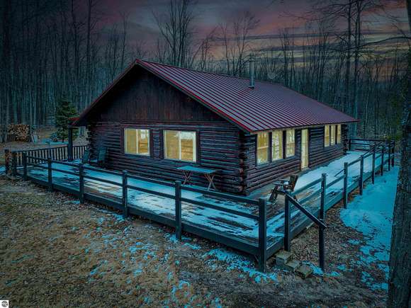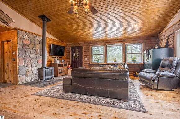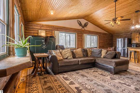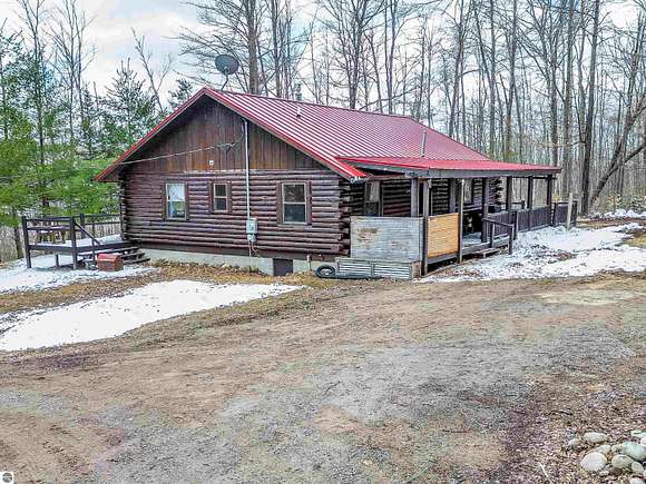 Welcome to this beautifully maintained, cozy log home nestled on 14.75 serene wooded acres, offering both privacy and tranquility. This charming two-bedroom, one-bathroom home features a stunning red metal roof that perfectly complements its rustic appeal. Step inside and admire the gorgeous wood accents, including live-edge window sills and kitchen bar, adding a unique, natural touch throughout the space. The home is equipped with a propane fireplace, providing efficient heat throughout the entire house, and the seller will be installing a brand-new furnace prior to closing, ensuring comfort for years to come. Step outside to find an ample shed and a large garage/outbuilding perfect for storage, hobbies, or any other projects you may have. The property is ideally located, adjacent to an expansive trail system, offering endless opportunities for outdoor adventures. With numerous lakes nearby and thousands of acres of state land only 7 miles away, the location is a nature lover's dream. Conveniently located with easy access to both Gaylord and Grayling, this property offers the perfect balance of seclusion and accessibility. Don't miss the chance to make this beautiful log home your own! The spacious property includes 3 connected parcels totaling the 14.75 acres.