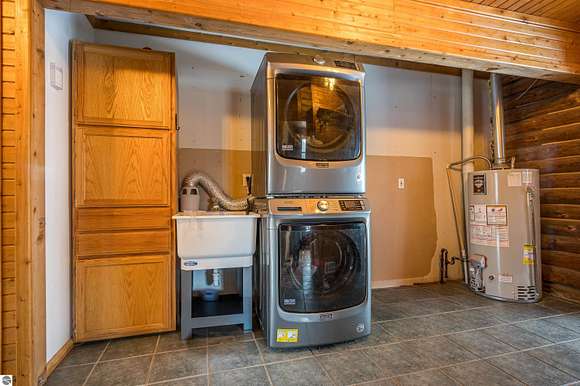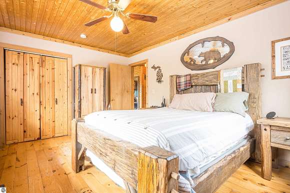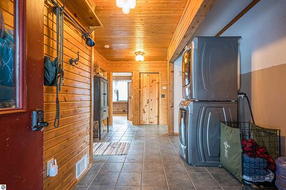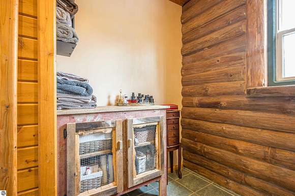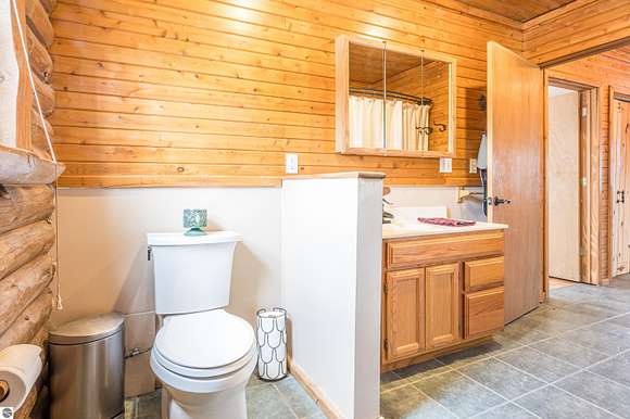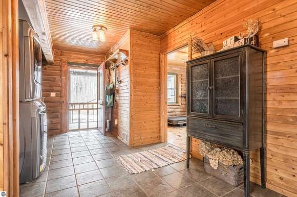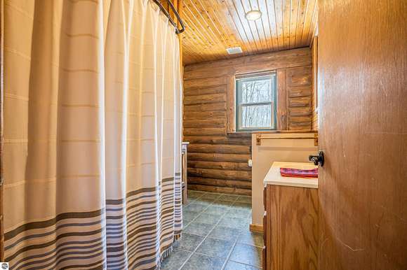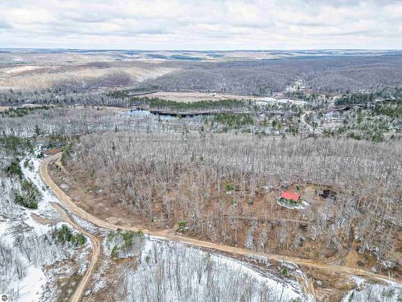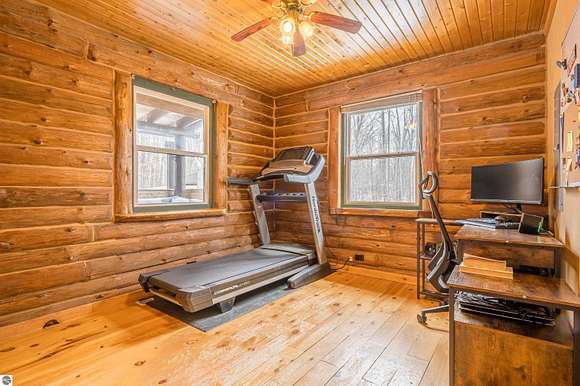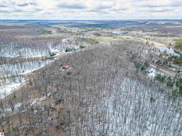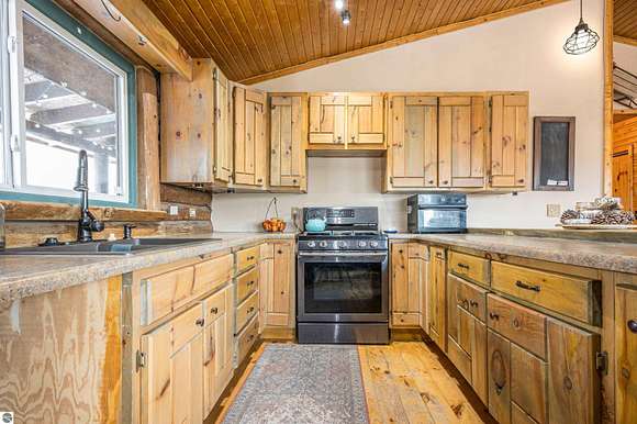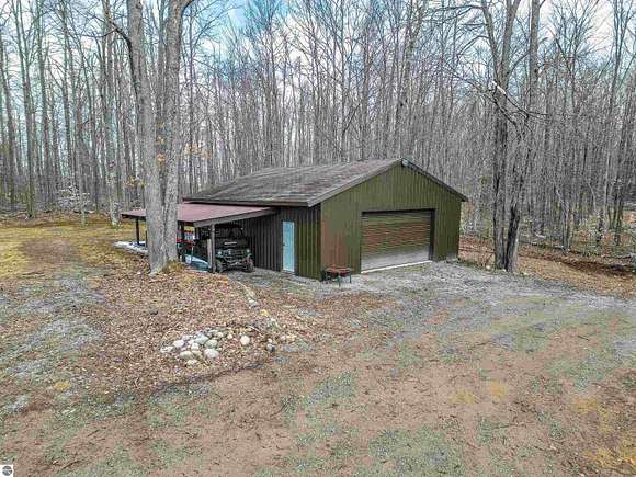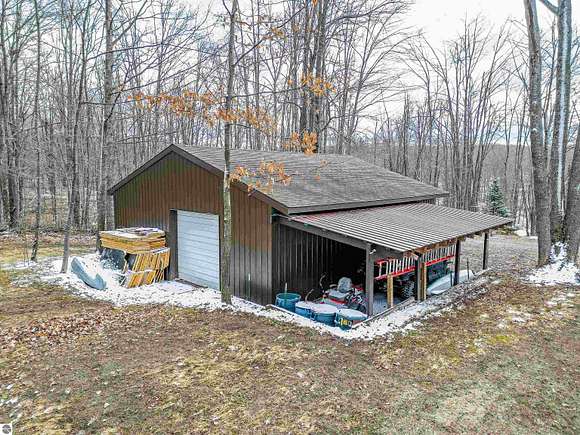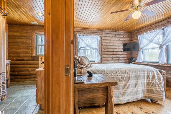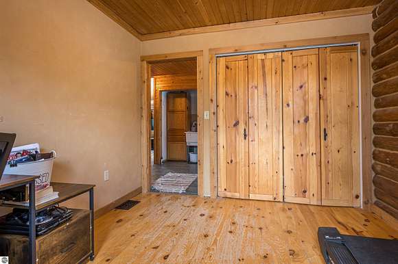 Welcome to this beautifully maintained, cozy log home nestled on 14.75 serene wooded acres, offering both privacy and tranquility. This charming two-bedroom, one-bathroom home features a stunning red metal roof that perfectly complements its rustic appeal. Step inside and admire the gorgeous wood accents, including live-edge window sills and kitchen bar, adding a unique, natural touch throughout the space. The home is equipped with a propane fireplace, providing efficient heat throughout the entire house, and the seller will be installing a brand-new furnace prior to closing, ensuring comfort for years to come. Step outside to find an ample shed and a large garage/outbuilding perfect for storage, hobbies, or any other projects you may have. The property is ideally located, adjacent to an expansive trail system, offering endless opportunities for outdoor adventures. With numerous lakes nearby and thousands of acres of state land only 7 miles away, the location is a nature lover's dream. Conveniently located with easy access to both Gaylord and Grayling, this property offers the perfect balance of seclusion and accessibility. Don't miss the chance to make this beautiful log home your own! The spacious property includes 3 connected parcels totaling the 14.75 acres.