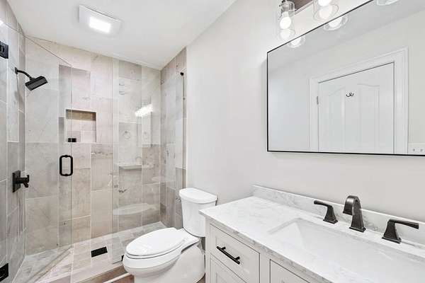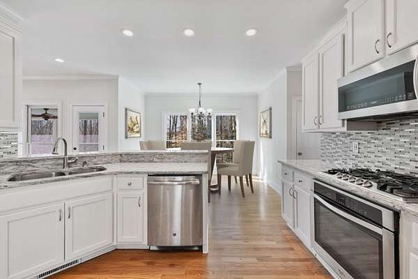 Exquisite south-end Lake Lanier home in the sought-after Harbors community, offering direct lake access, a sparkling private pool with an expansive pool deck, and a covered dock with dual Sea-Doo ports and a swim platform. Tucked in a quiet cove, the property sits on a large corner lot with a fenced backyard and wooded views. Located near Hideaway Bay, Aqualand, and Port Royale marinas and just minutes from Historic Downtown Flowery Branch, this home is perfect for those seeking the lake lifestyle without sacrificing comfort or convenience. Inside, a two-story Foyer welcomes you into a spacious Den and Formal Dining Room. The Chef's Kitchen features stainless steel appliances, granite countertops, and a sunny Breakfast Room. The adjacent Family Room includes a cozy fireplace and opens to a screened-in porch-ideal for outdoor dining or simply enjoying the peaceful setting. Upstairs, the Primary Suite features tray ceilings, a Sitting Area, and a large Bath with heated tile floors, dual vanities, a clawfoot soaking tub, a custom multi-jet shower with a bench, and a walk-in closet. Three additional Guest Bedrooms and a renovated Guest Bathroom complete the upper level, providing comfortable space for family and guests. The finished Terrace Level includes a private Secondary Suite with an ensuite Bath and walk-in closet, a Billiards Room, Media Area, and a versatile Flex Room perfect for a Home Office or Gym. A second screened-in porch opens to the backyard and pool-great for entertaining or relaxing in a low-maintenance outdoor space. Recent updates include a NEW roof, NEW energy-efficient windows throughout the home, including all bedrooms and the entire front-facing side, and NEW refinished hardwoods on the Main Level. Premium wide-plank flooring was installed on the Upper and Terrace Levels, offering seamless hard-surface finishes throughout. The entire interior and exterior have been freshly painted, and the two-car garage is equipped with NEW insulated doors and LiftMaster MyQ smart openers. The Home presents an outstanding opportunity to experience the Lake Lanier lifestyle in a quiet, established community. This Certified Move-In Ready Home has been professionally inspected, includes a comprehensive 2-10 Home Warranty, and is priced below recent appraisal, providing instant equity.