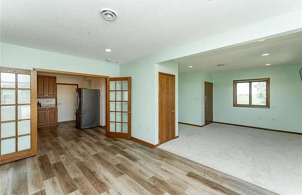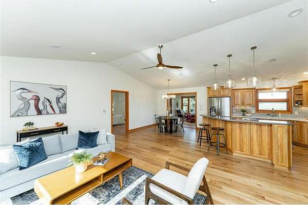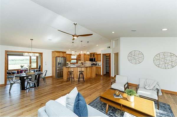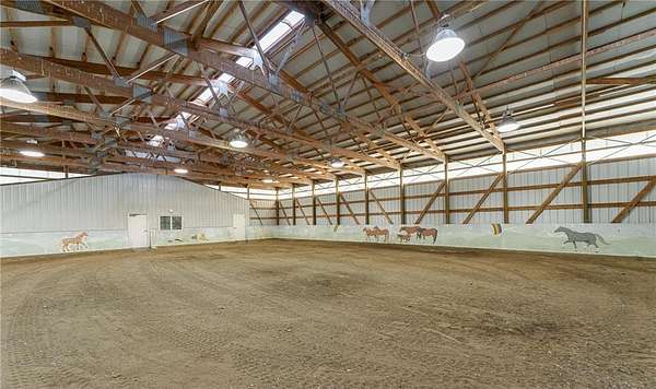 Rare equestrian property just minutes from downtown! Exceptional opportunity in SW on nearly 8 scenic acres. This one-level walkout offers 4,000 sq ft, blending high-end renovations with peaceful acreage and top amenities for horse lovers and hobbyists. The refreshed main level features vaulted ceilings, a sunroom with heated floors, and a stunning kitchen with new quartz counters, tile backsplash, stainless appliances. Rich hardwood floors and modern glass lighting fixtures create a refined, welcoming space. The primary suite includes a private deck, new tiled shower, and massive walk-in closet. The generous mudroom includes a dog washing station and main-floor laundry. Two additional main-floor bedrooms share a walk-through full bath. The lower level has two more bedrooms, full bath, expansive walkout family room, and a newly added bonus room with LVP flooring—perfect for gym, studio, or storage. Property hosts a heated indoor arena with office, oversized heated attached and detached garages, stable, paddock, chicken coop, circle driveway with dual entrances, new roofs on all buildings, updated compliant septic, mature trees, and beautiful countryside views. Close to town, this one-of-a-kind home delivers lifestyle and luxury.