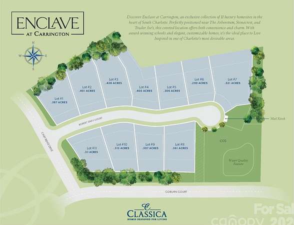 Discover South Charlotte's newest luxury community - Enclave at Carrington! Enclave at Carrington is an exclusive community featuring 11 premium homesites in one of South Charlotte's most desirable locations. Enclave at Carrington blends serenity and convenience, offering a rare opportunity to build your dream home in a quiet, private setting while staying close to everything you love about South Charlotte - world-class shopping, fine dining, miles of greenway trails, and beautiful parks. Minutes from Stonecrest, Ballantyne, SouthPark, Arboretum, Waverly, and Rea Farms!
