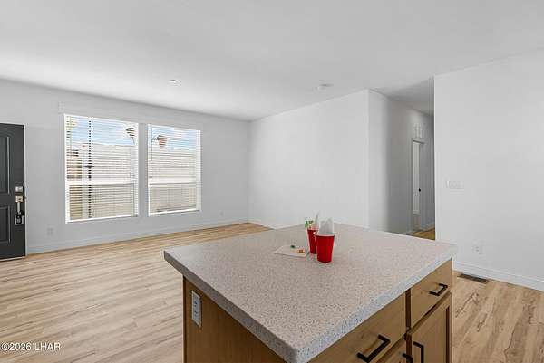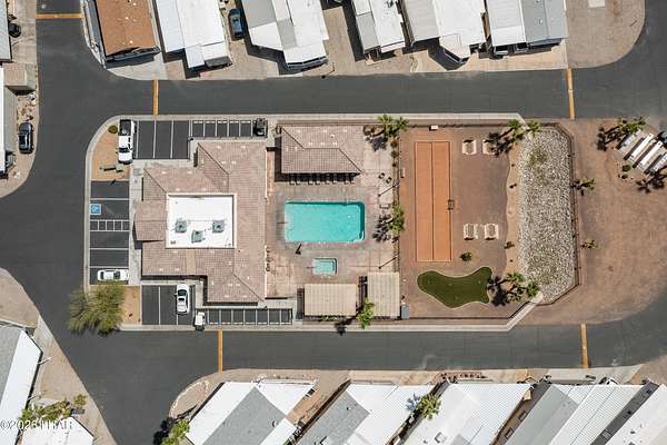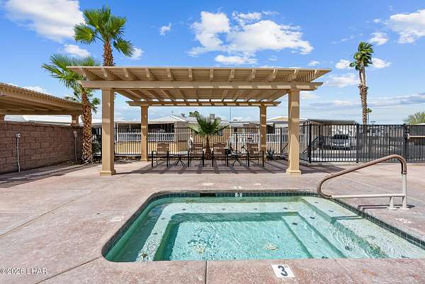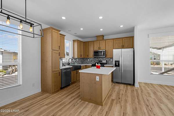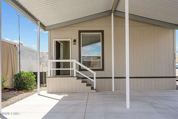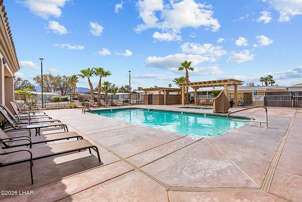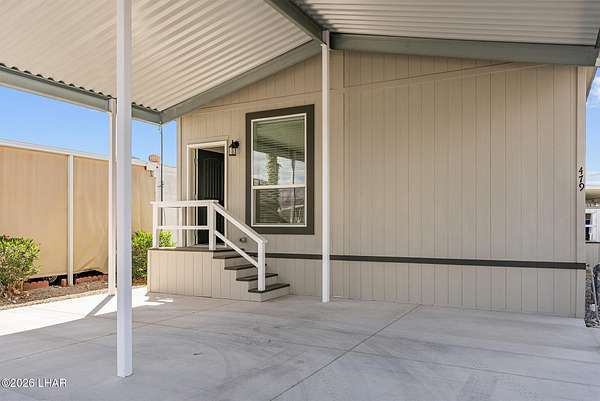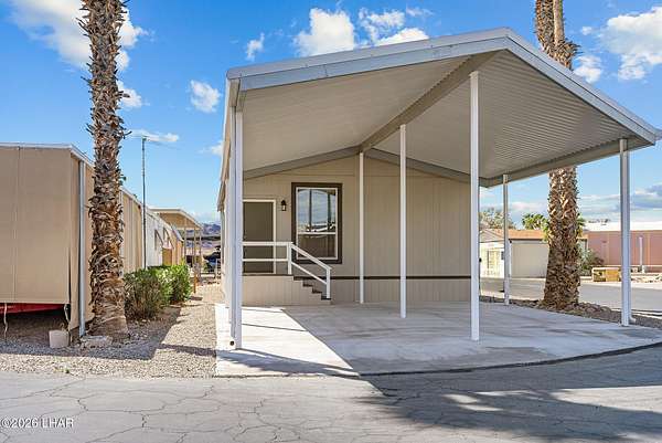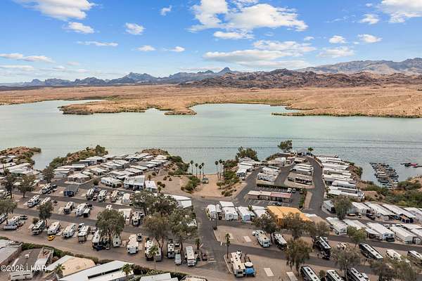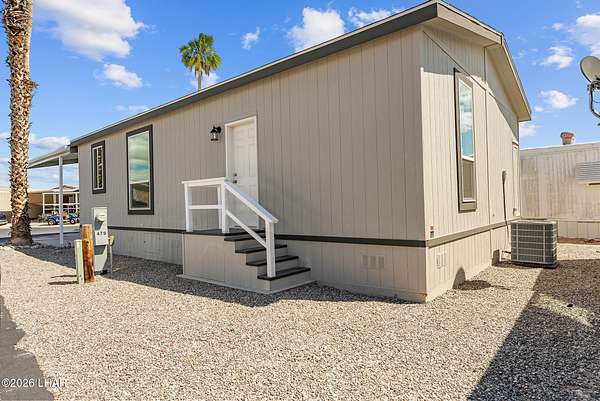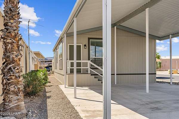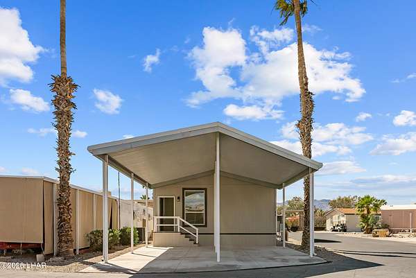 BRAND NEW 2025 CAVCO DOUBLE-WIDE: Experience modern living in this brand-new 932-square-foot home that offers a perfectly designed layout featuring 2 bedrooms and 2 bathrooms. The heart of the home is a bright, open kitchen with elegant quartz countertops, a farmhouse sink, and sleek stainless steel appliances, all set against beautiful vinyl faux-wood flooring. Luxury extends to the bedrooms featuring plush carpeting for a cozy retreat, while the primary suite boasts an upgraded luxury shower panel system. A dedicated laundry room adds everyday convenience to this sophisticated, low-maintenance 24' x 40' footprint. And you cannot miss the expansive durable metal awning covering the driveway, providing extensive overhead clearance and ample space for large trucks, boats, and all your desert toys. Perfectly situated on the island just minutes from the boat launch, this home is located within a private gated community. Residents enjoy premium amenities, including a clubhouse with a full kitchen, poker and billiard tables, a heated and chilled pool, spa, and bocce ball court. This is modern island living at its finest.