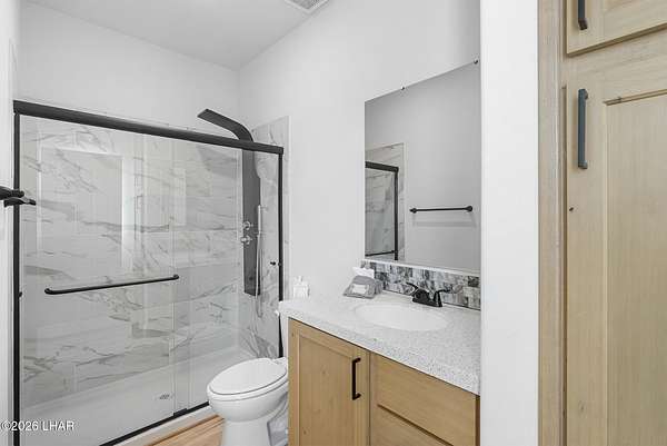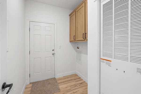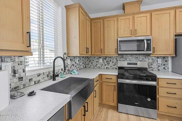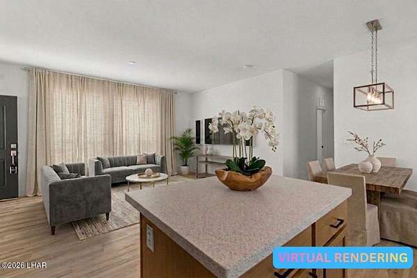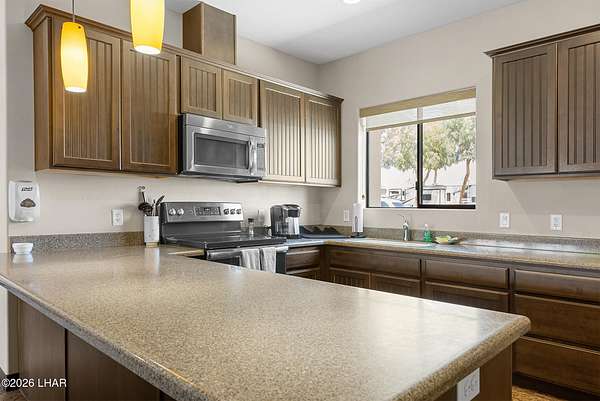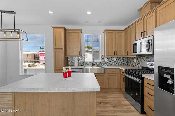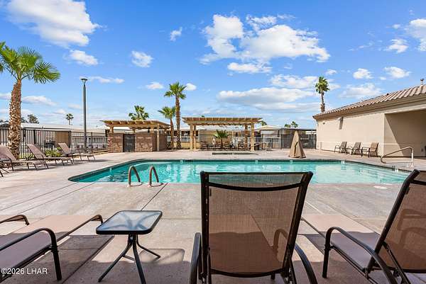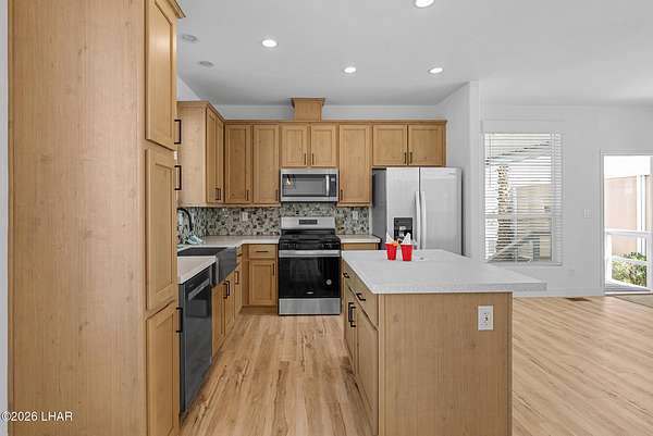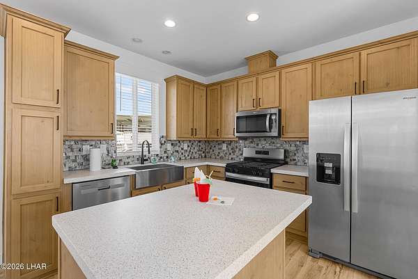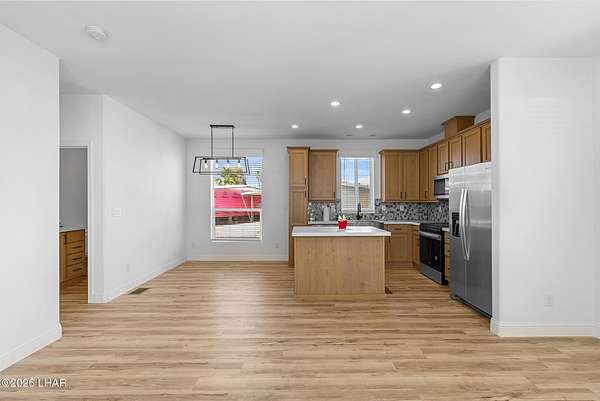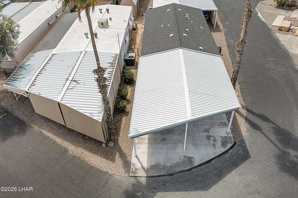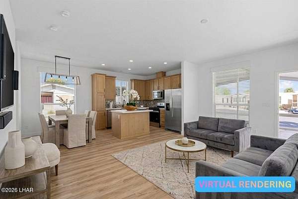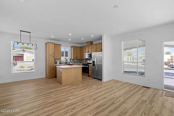 BRAND NEW 2025 CAVCO DOUBLE-WIDE: Experience modern living in this brand-new 932-square-foot home that offers a perfectly designed layout featuring 2 bedrooms and 2 bathrooms. The heart of the home is a bright, open kitchen with elegant quartz countertops, a farmhouse sink, and sleek stainless steel appliances, all set against beautiful vinyl faux-wood flooring. Luxury extends to the bedrooms featuring plush carpeting for a cozy retreat, while the primary suite boasts an upgraded luxury shower panel system. A dedicated laundry room adds everyday convenience to this sophisticated, low-maintenance 24' x 40' footprint. And you cannot miss the expansive durable metal awning covering the driveway, providing extensive overhead clearance and ample space for large trucks, boats, and all your desert toys. Perfectly situated on the island just minutes from the boat launch, this home is located within a private gated community. Residents enjoy premium amenities, including a clubhouse with a full kitchen, poker and billiard tables, a heated and chilled pool, spa, and bocce ball court. This is modern island living at its finest.