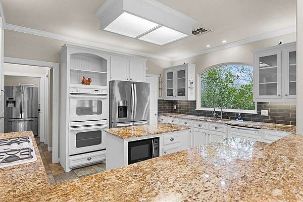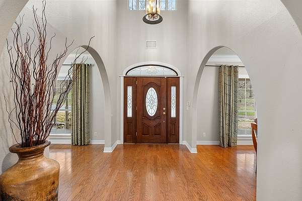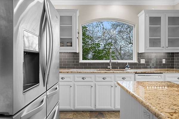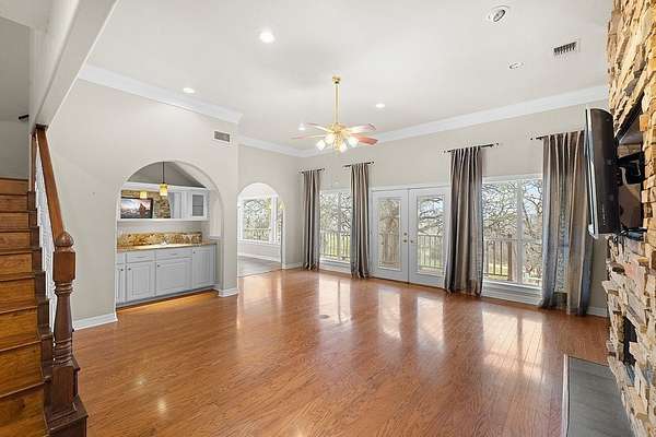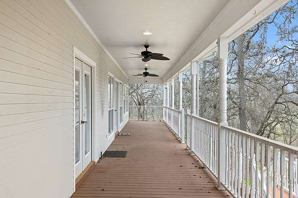 This exceptional 4-bedroom, 3.5-bathroom home is situated on 2.4 acres, providing a serene retreat surrounded by nature while maintaining convenient proximity to town amenities. The property offers tranquility, featuring oversized front and back porches and a spacious yard with mature trees ensure privacy. Entering the home, guests are welcomed by a grand chandelier and vaulted ceilings, setting an elegant tone. The living room includes a wet bar, a floor-to-ceiling stone gas fireplace complimented by built-in lower cabinets with the floorplan flowing seamlessly into a well-appointed breakfast area featuring large windows for abundant natural light. The primary suite is located on the main level, offering private access to the back porch with views of the Colorado River. The ensuite bathroom boasts a luxurious soaking tub, separate walk-in shower, dual vanities with built-in cabinetry, an expansive walk-in closet with built-in drawers and a shoe rack, and a dedicated bathroom area. An additional bedroom and full bathroom are also conveniently located downstairs. Upstairs you'll find a versatile flex space that can serve as a game room or second living area. Two spacious bedrooms at opposite ends share a bathroom. Additional amenities include a half bath, a large laundry room, motion-activated lighting, upper and under-cabinet kitchen lighting, abundant storage and closet space. There is no HOA associated with this property.