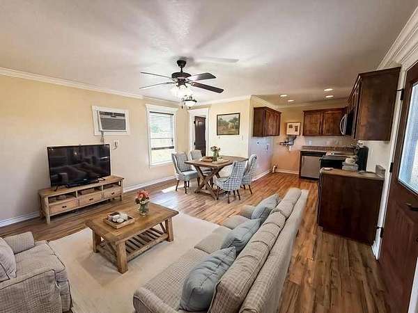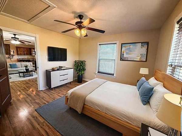 A 512 SF cabin provides a comfortable setup with a large bedroom, full bathroom, and open living, kitchen, and dining area with granite countertops, perfect for weekend stays or living on-site while building.