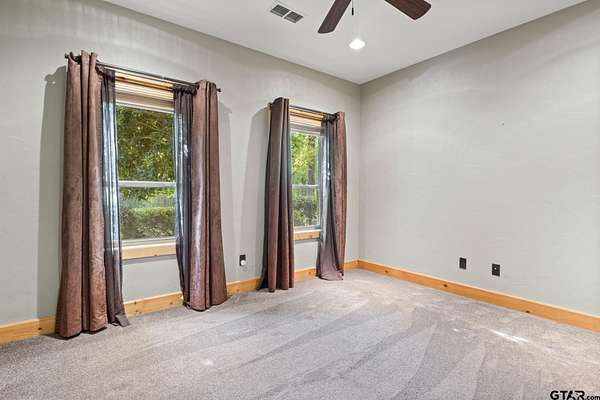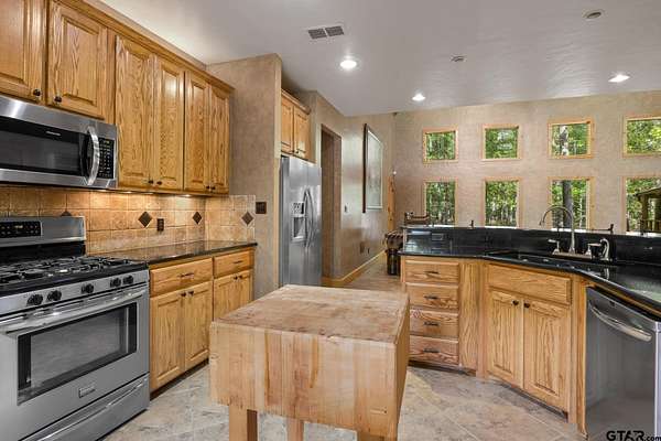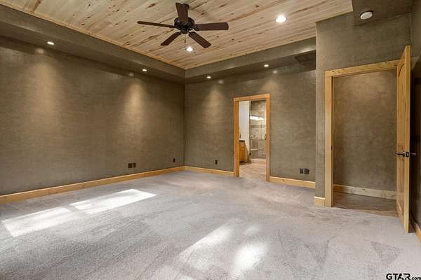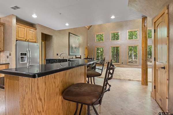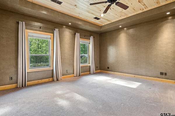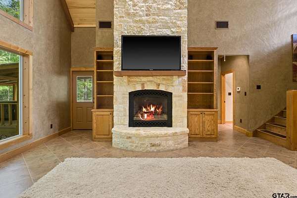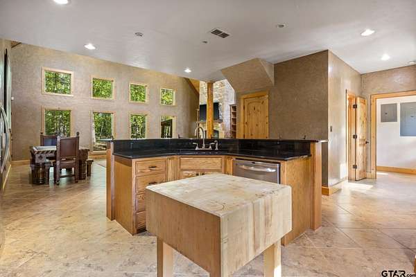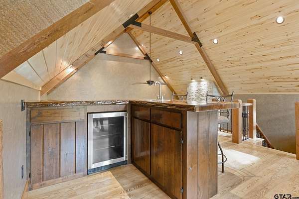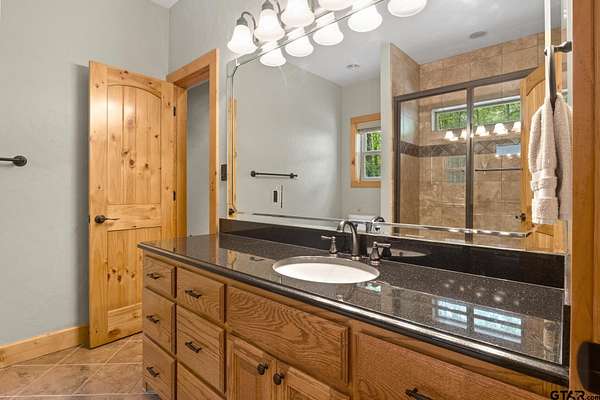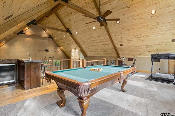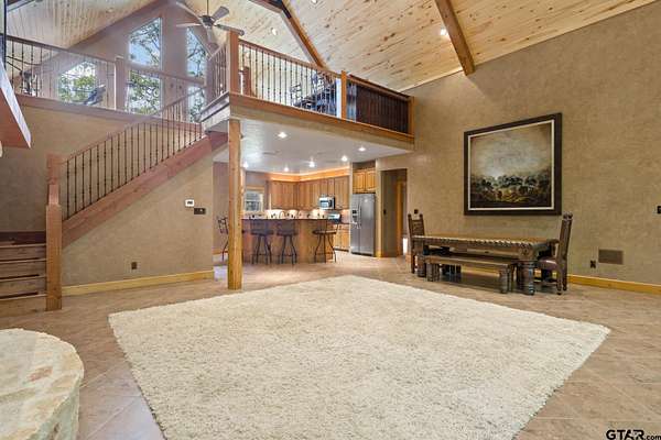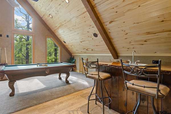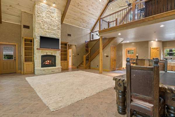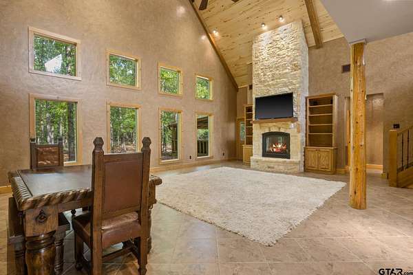 Luxury and privacy come together in this stunning custom cedar and stone home, ideally situated on 4.9 acres just minutes from both Lake Cypress Springs and Lake Bob Sandlin. With Cypress Springs boat launch only one mile away and Bob Sandlin just three miles down the road, this property offers rare proximity to two of East Texas’ most sought-after lakes—perfect for boating, entertaining, and weekend getaways. Inside, the home makes an unforgettable first impression with soaring 26-foot aspen ceilings, massive spruce beams, and a dramatic floor-to-ceiling rock fireplace anchoring the main living space. The open-concept design flows seamlessly into a beautifully appointed kitchen with granite countertops, ideal for both everyday living and hosting. The primary suite is a true retreat, featuring dual vanities, a spa-inspired soaking tub, an oversized travertine tile shower with bench, and a spacious walk-in closet with thoughtful built-ins. Upstairs, the loft creates the perfect entertaining space, complete with a custom black walnut wet bar, refrigerator, and TV hookup—ready for game days or relaxed evenings with guests. Step outside and enjoy the space and versatility this property offers, including a 40x60 shop with approximately 500 square feet of living quarters—ideal for guests, a private office, or additional living space. Set on nearly 5 acres with a prime location near both lakes, this property delivers the perfect blend of luxury, functionality, and lifestyle—whether you’re looking for a full-time residence or the ultimate weekend escape. Call today to schedule your private showing!