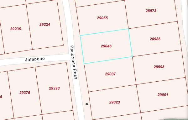 From 281 North, take 71 West, take a right on Clayton Nolen Dr, then a left on Hi Mesa, then a right on Panorama Pass. The lot will be on the right. It is the lot directly across from Jalapeno Street.
