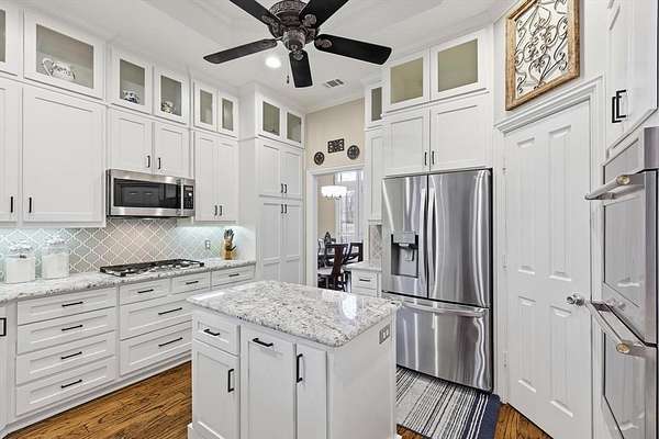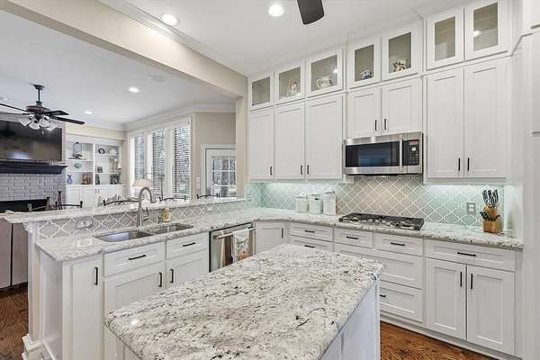 The chef's kitchen is thoughtfully updated with new soft-close cabinetry, double ovens, and a five-burner gas cooktop--perfectly suited for both everyday living and hosting on a grand scale.