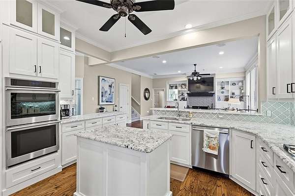 The chef’s kitchen is thoughtfully updated with new soft-close cabinetry, double ovens, and a five-burner gas cooktop—perfectly suited for both everyday living and hosting on a grand scale.