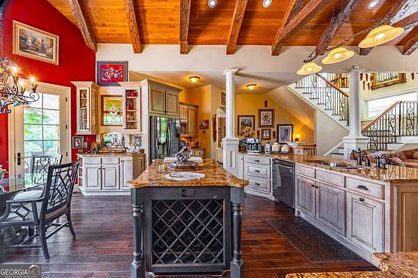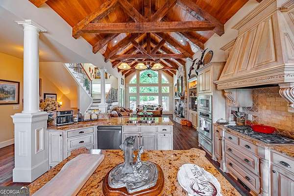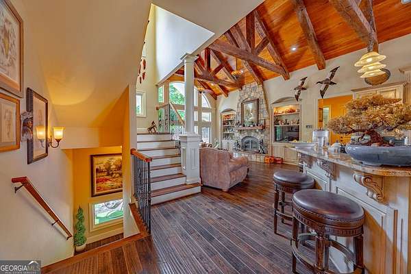 One of a kind custom home in River Forest. This home boasts curb appeal like no other. Walking into the double front doors, you are greeted with exquisite craftsmanship. Off the foyer you will find the sitting room along with the formal dining room, both including oversized windows and tray ceilings. Stretching over the living room and kitchen are beautiful timber-framed vaulted ceilings. In the kitchen you will find custom cabinetry, stainless steal appliances and a walk-in pantry. The living room includes custom built ins, a stone fireplace, and large arched windows and sliding glass doors, allowing for optimal natural lighting. Oversized bedrooms, a walk in laundry room, and large primary suite are all features found on the main floor. Upstairs includes a large suite, living/bonus room, wet bar, and roof top deck overlooking adjacent lot (included with home). The basement is fully finished, including a theater room, large kitchen, living room, safe room/wine cellar and a bedroom and full bath. The basement also includes access to one of the 3 separate garages that doubles as a great entertainment area. The outside space of this home is as impressive as the inside features. With three levels of patio/ outdoor space, this home doubles as a private oasis and an entertainers dream. Waterfall, outdoor kitchen, and fenced grass area are all statement pieces of the outdoor living area. In addition, there is a separate guest house/office with a half bath over a detached garage. This home truly has it all! Monroe County Schools. River Forest is a gated community offering an 18 hole championship golf course, full service clubhouse, swim, tennis and workout facilities. *OWNER FINANCE AVAILABLE, CALL LISTING AGENT FOR MORE INFO*
