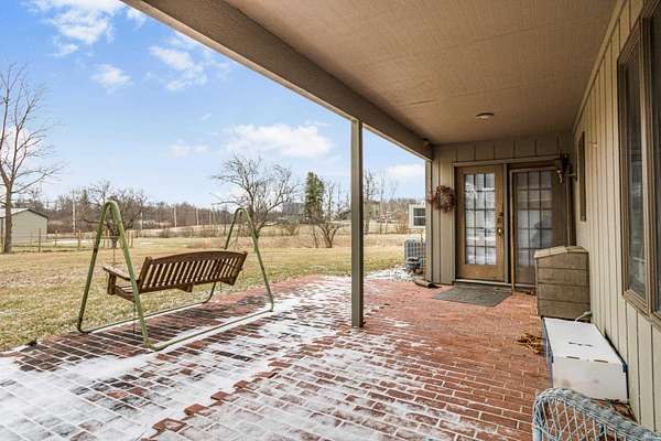 Situated along the edge of open farmland, this 4-bedroom, 2-bath home offers space, comfort, and a peaceful setting. The main level features a welcoming foyer entry leading into a large living room with a wood-burning fireplace. The kitchen includes an island and opens to a designated dining area, creating a functional and inviting layout for everyday living and entertaining. A desirable split floor plan provides privacy, with the primary bedroom and private bath located on one side of the home, while two additional bedrooms and a full bath are positioned on the opposite end. Upstairs, a fourth bedroom offers abundant natural light through large windows overlooking the front yard and trees. Additional highlights include a spacious yard and a detached garage, making this property an ideal blend of space, privacy, and country-edge living.