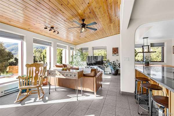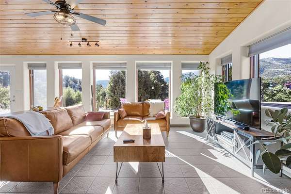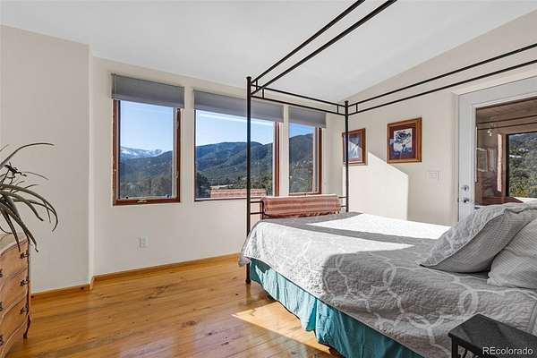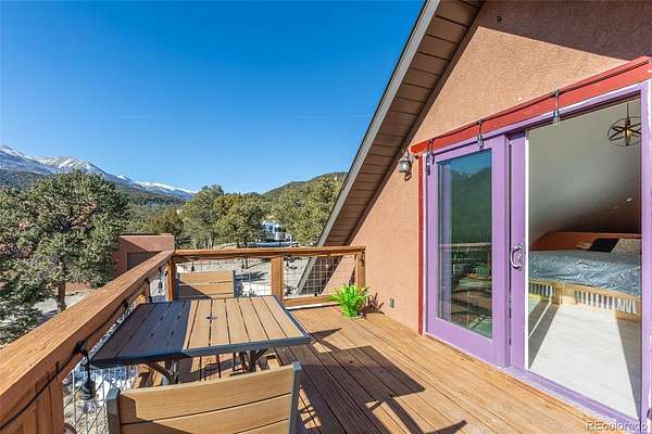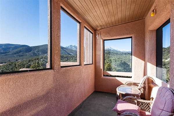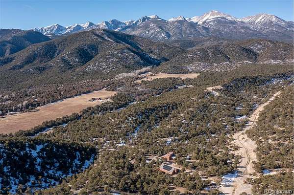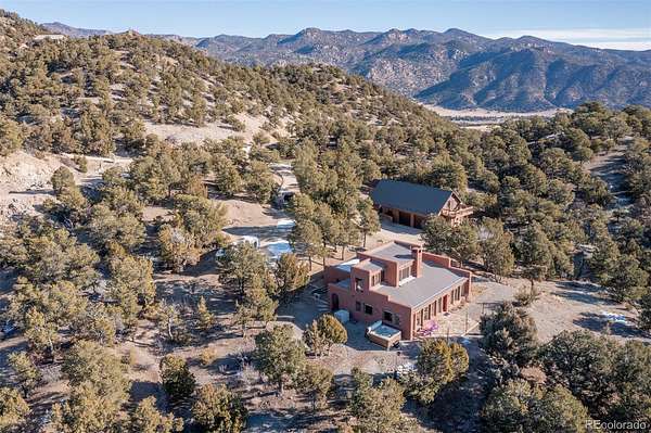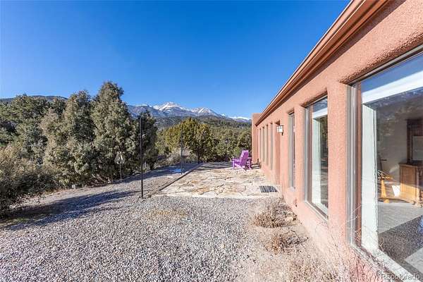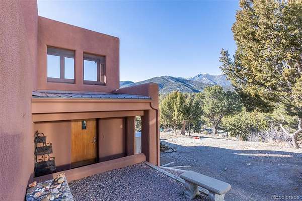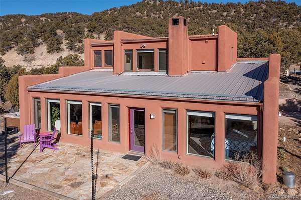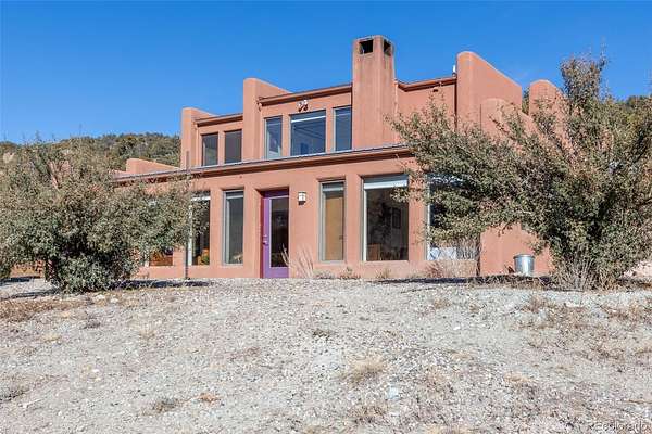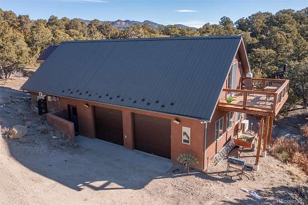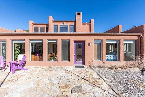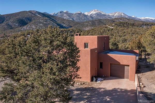 Beautiful energy efficient southwest-style home on 39 +/- acres, 25 minutes from Salida. This secluded, south-facing home takes in magnificent mountain views. Ideally situated for solar gain in the winter months, the home also features 16" concrete walls for extra energy efficiency. The main house features a kitchen with granite counters, near-new appliances and breakfast bar. The kitchen opens onto a light-filled dining / living area with wood stove and tile floors that retain the warmth of the wintertime sun. The living area in turn opens on to a flagstone patio and hot tub for outdoor living and starry nights. A primary suite with 3/4 bath including walk-in shower and large walk-in closet, laundry and hallway access to an oversized one car garage rounds out the main level. Upstairs is a second bedroom with beetle kill floors, 3/4 bath and screened- in porch for taking in the Sangre de Cristo views. The detached oversized two car garage with guest quarters also boasts a bar and game room with pool table for entertaining. Above the garage and game room is a generous apartment / living area with kitchenette, 3/4 bath and south facing deck and second laundry. Also included is a 50 amp RV hook up and propane-powered back up generator. An 8.68 kw net meter solar system ensures energy efficiency. The 39+/-acre lot has approx 5 miles of private trails for hiking and biking. Public access to the Arkansas River is 5 minutes away. The property has been used as a successful vacation rental in the past.