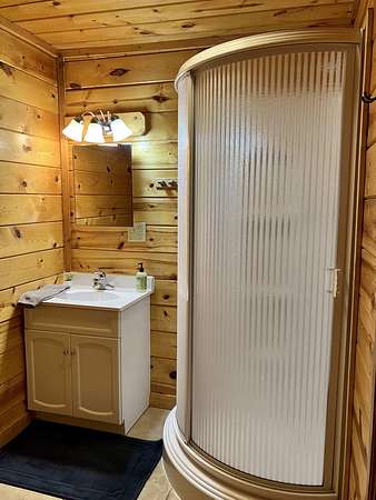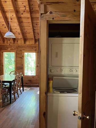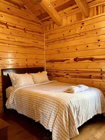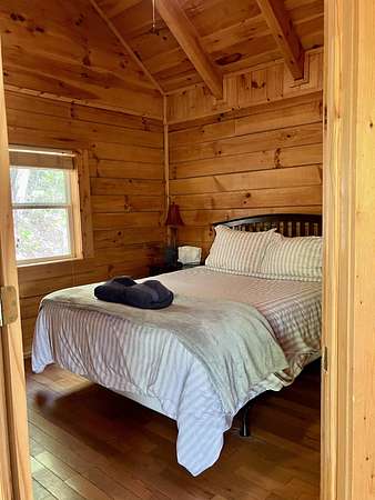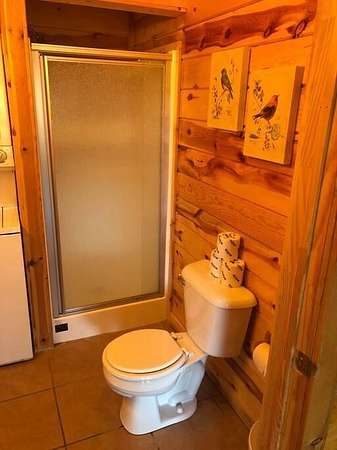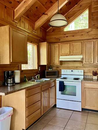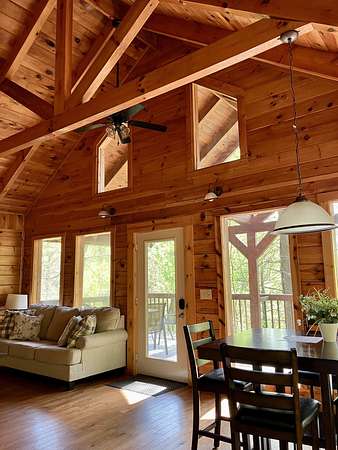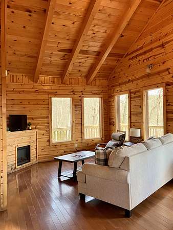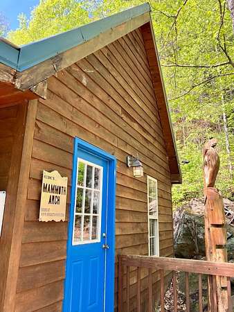 Take the Mountain Parkway to exit 33, turn left then left again at the end of the road. Go approx one mile and turn right on HWY 77. Go one mile then turn left on Twin Arch Rd. Go up the hill and look for the driveway on the left that has directions to cabins Wildwood, High Rock, Tall Timbers, Wildcat and Mammoth. These are the cabins (Sandstone cabin is just past this drive on the right on the main road. When you turn onto the drive with the 5 cabins, you will see the arch on your right