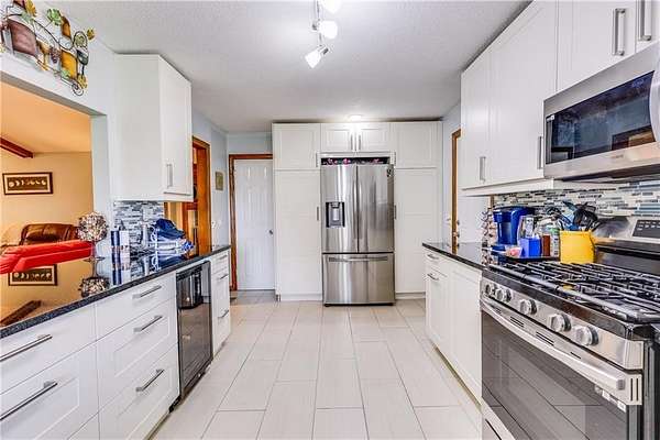 The kitchen is completely updated with a gas range and oven, microwave, wine cooler, large appliance pantry, granite countertops, farmhouse sink, garbage disposal, under counter lighting, french door refrigerator with freezer below. All kitchen and bath faucets are lifetime warranty through Kohler.
