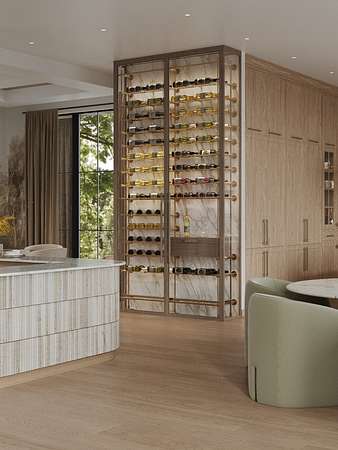 Interior highlights include 9.5" hardwood floors, a chef's kitchen with Wolf appliances and a separate prep kitchen, a wine cellar, a custom bar, a bonus room, a theater, and a private guest suite with its own covered porch. The home is elevator-ready and golf simulator-ready.