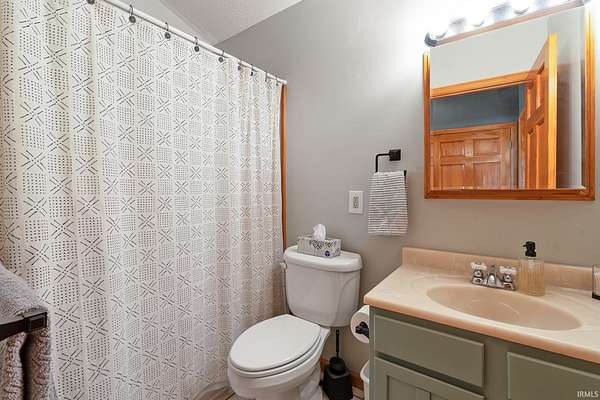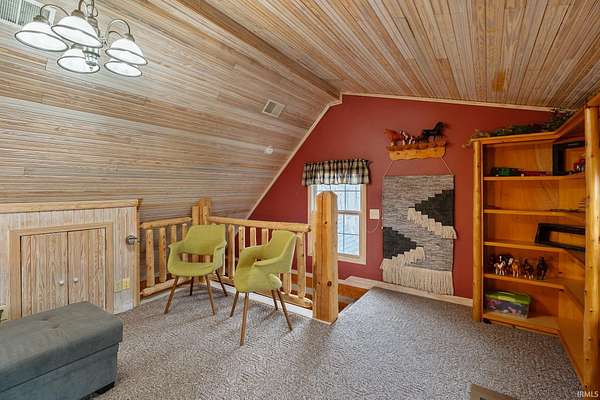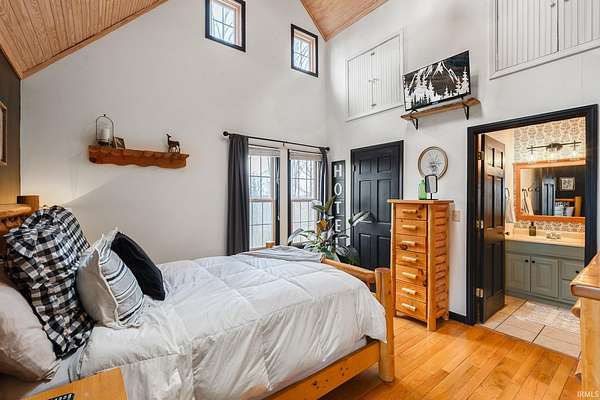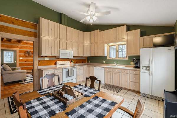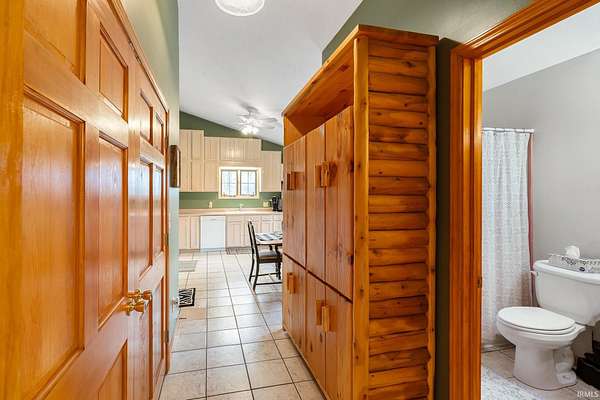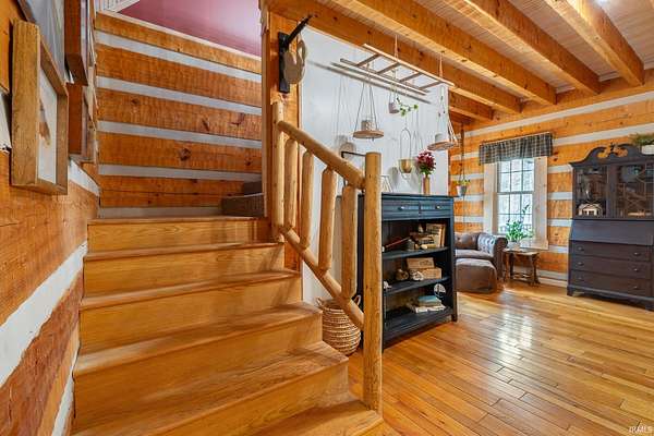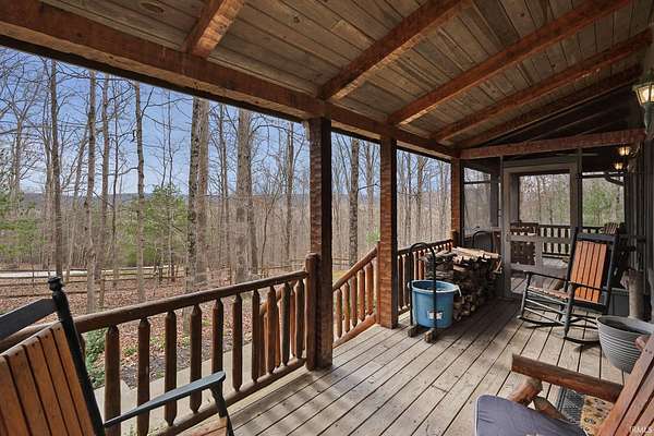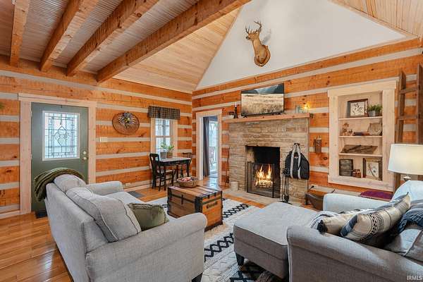 Nestled among five wooded acres and perfectly situated between Bloomington/Indiana University and Nashville/Brown County State Park, this 2BD/2BA hand-hewn log cabin offers rustic charm with all the comforts of home. A tree-lined walking path leads to a covered front porch — where the pace of life slows and the sounds of nature take over. The living room sets the tone with 12” hand-hewn logs and a stone wood-burning fireplace, creating a warm and welcoming space year-round. The country kitchen features double-stacked cabinetry with plenty of storage for everyday living. The main-level primary suite includes an ensuite bath, walk-in closet, and patio doors opening to a screened porch. Down the hall, a convenient laundry area leads to the second bedroom and full bath — great for guests or family. Outside, a deck and firepit offer great spots to unwind, and a footbridge crosses to a detached crafter’s cabin ideal for a studio or workshop. The oversized 2-car garage provides ample storage, plus a covered area sized for an RV or boat. Peaceful and private, yet just minutes from the restaurants and galleries of Nashville and the energy of Bloomington — this cabin is a rare find. UPDATES: 2023: New paint throughout; 2024: New HVAC System; 2025: New Dishwasher and Garbage Disposal