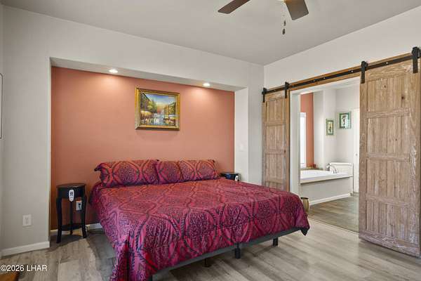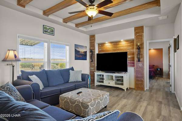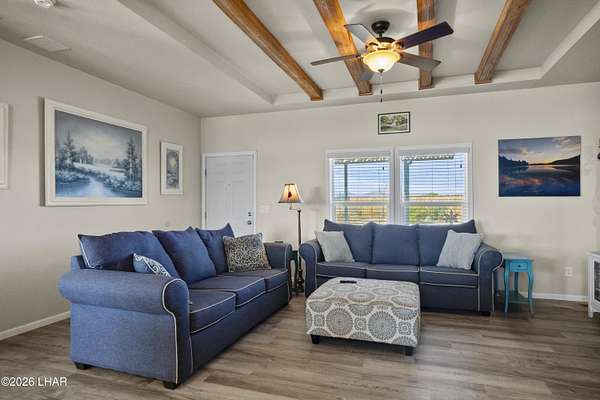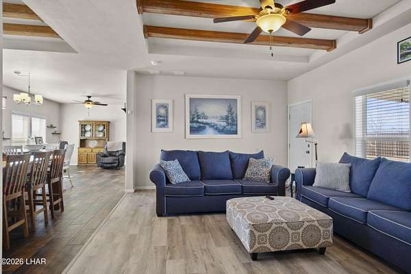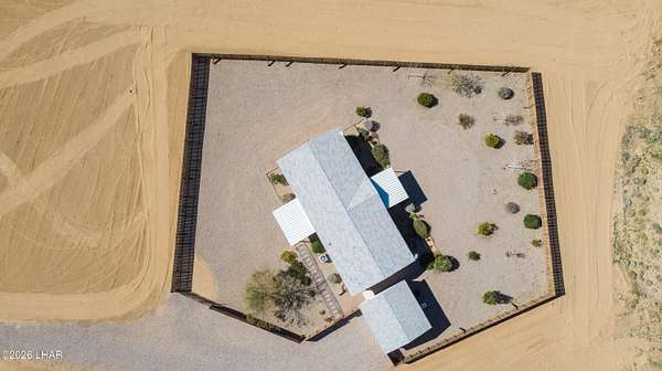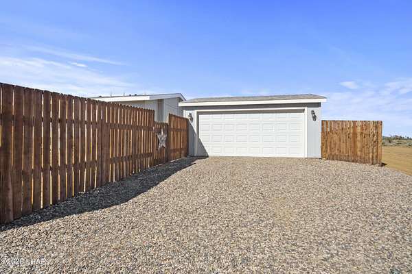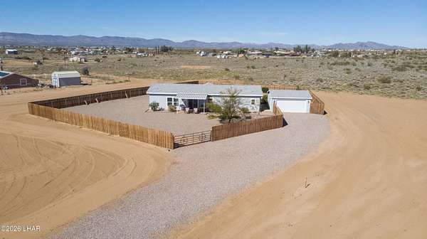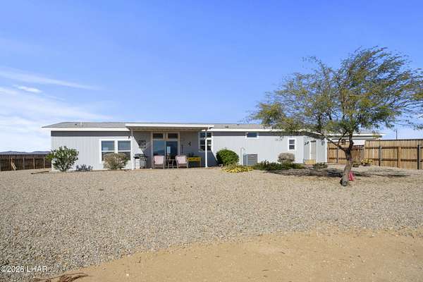 WOW from every angle! Located on a premium corner lot spanning nearly 2.5 acres, this beautifully cared-for 3-bedroom, 2-bath home offers 1,657 sq ft of open, airy living designed for comfort and functionality. Inside, you'll love the 9' flat ceilings and ceiling fans in every room, enhancing the spacious feel throughout. The open-concept layout is accented by stylish vinyl plank flooring in the family room and primary bedroom and a well-appointed kitchen featuring stainless steel appliances-perfect for everyday living and entertaining. Enjoy outdoor living at its best with covered front and rear patios, while complete privacy fencing creates a peaceful, private setting. The property is thoughtfully equipped with exterior motion-sensor lighting around the entire home, a motion-sensor driveway alert, and a 16' RV gate for easy access. A detached 2-car garage and abundant RV and vehicle parking add incredible versatility. Additional highlights include underground utilities and public water, offering modern convenience with wide-open space. This home delivers privacy, security, and pride of ownership in one exceptional package.