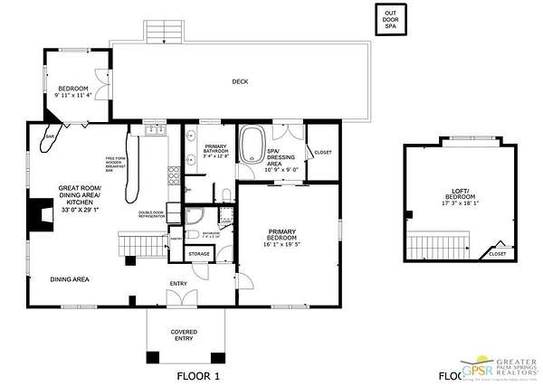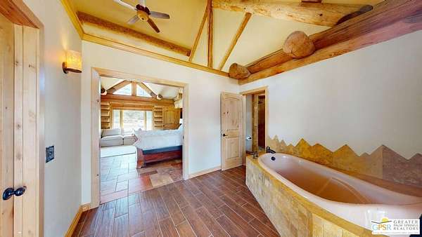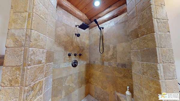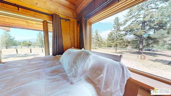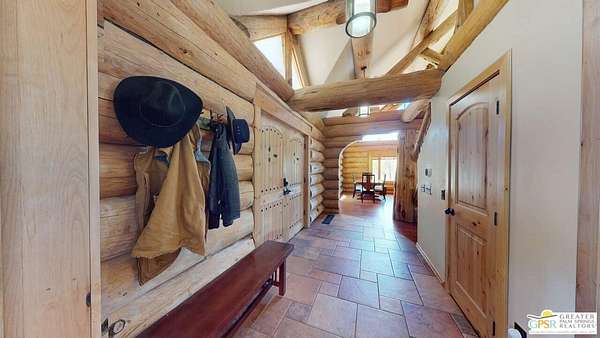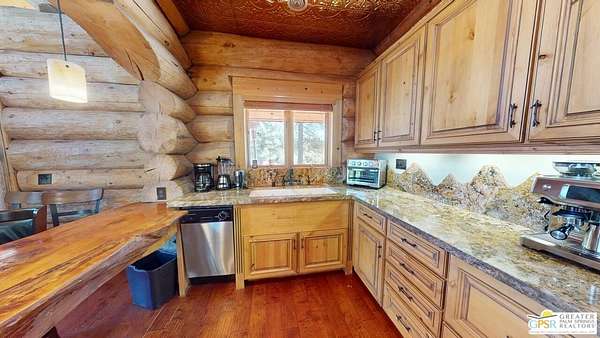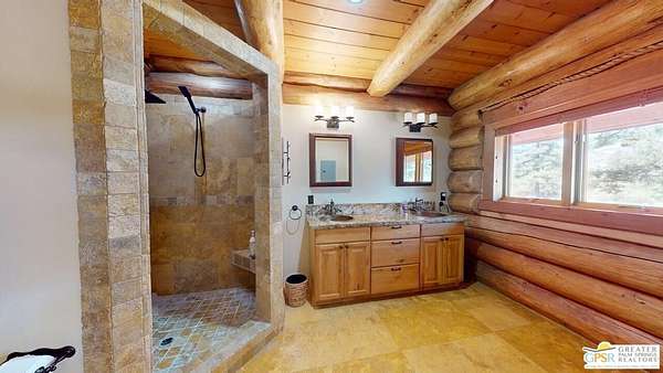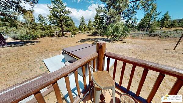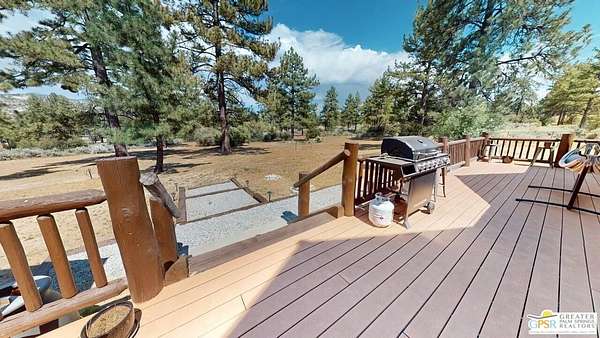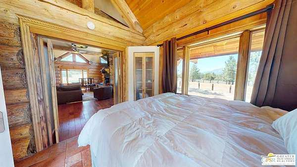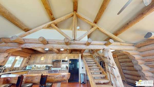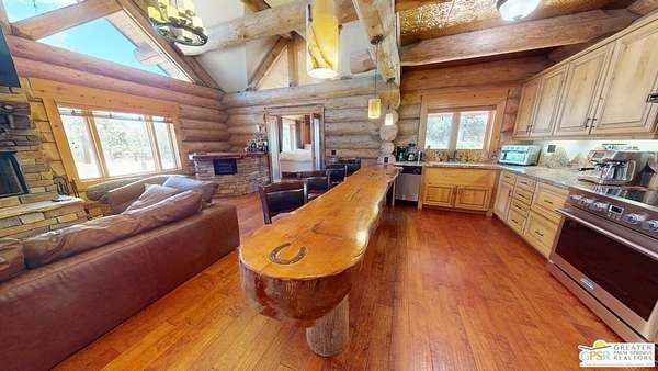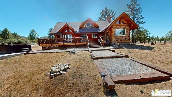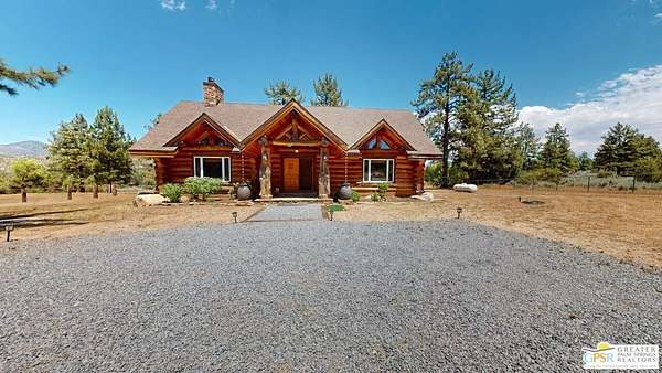 ALL OFFERS WILL BE CONSIDERED for this one-of-a-kind Log Home. It will be a special place for you to call home. Whether used for full-time residency or as a second home, the serenity of this open concept 4.5 acres, is sure to please the most discerning buyer. The Log Home includes a large entry foyer which sets the stage for all the interior spaces of this home. To the left of the entry is the large Great Room with wood burning fireplace, Dining area and Kitchen featuring a whimsical breakfast bar made entirely of a free form log - stunning! The two-story plus high ceilings and the use of the natural log walls lend themselves to the unique character of this special residence. The Great Room is light and bright just perfect for both intimate gatherings or large-scale parties. The views of the mountains in the distance are incredible. The kitchen features granite counters with custom designed backsplashes that depict the mountains - very clever - plus the new electric range/oven, pot-filler and vent hood, double door refrigerator, microwave oven, dishwasher and a semi-hidden pantry closet under the stairs to the loft complete the open kitchen. There is a free form log bar in the corner of the Great Room as well. To the right of the front door is access to the large Primary First Floor Suite with extremely high ceilings and a ceiling fan and access to the combination dressing room/spa room and then on to the primary ensuite bath. The stall shower has beautiful stone work. The double vanity, with granite counters, is great as well. The views from the bathroom and primary suite are exquisite, as they are from the other rooms in this well designed home. The dressing/spa room offers direct access to the north facing deck with room for outdoor entertaining and the outdoor spa, just a few steps away. At the other end of the home, the French doors off the Great Room lead to the first floor bedroom, which could also be used as an office or study. This room also offers access to the north facing deck. Besides the first floor bathroom - with the stackable laundry closet - up the stairs is the additional lofted bedroom - extremely light and bright featuring lovely views to the north. The property is well maintained with pastures for a myriad of uses and the electronically operated iron gate sets the stage for what awaits owners and visitors to this massive property. Located within a 45 minute drive to Palm Desert - El Paseo - shopping and dining and the property is about a 25 minute drive to Idyllwild/Pine Cove. The Paradise Valley Cafe, at the corner of Hwy 371 and Hwy 74 is a great dining location just a few miles to the east of the property. The community has it's own clubhouse known as the Garner Valley Property Owners Association also located on Devils Ladder Road. Easy to show. Welcome to your new Mountain Home!