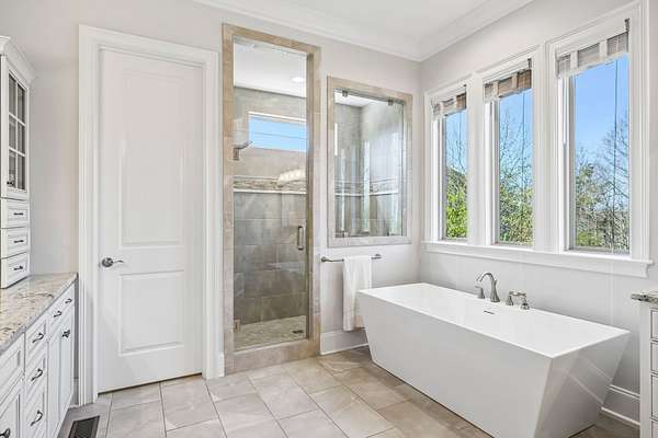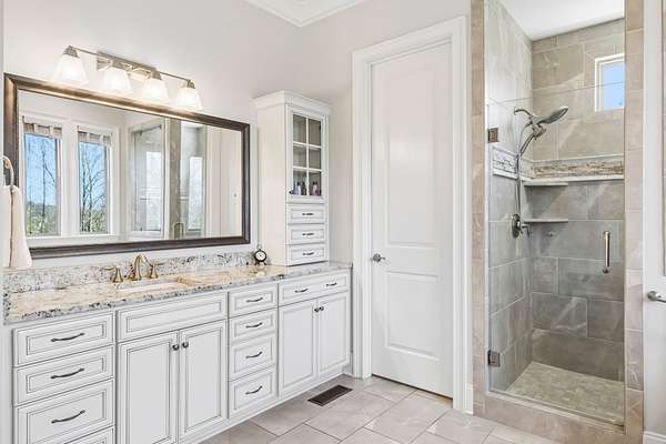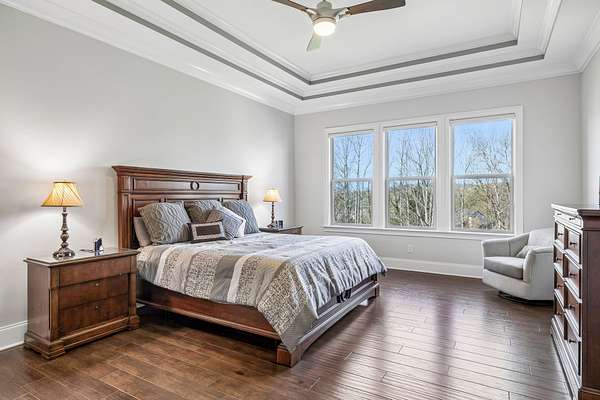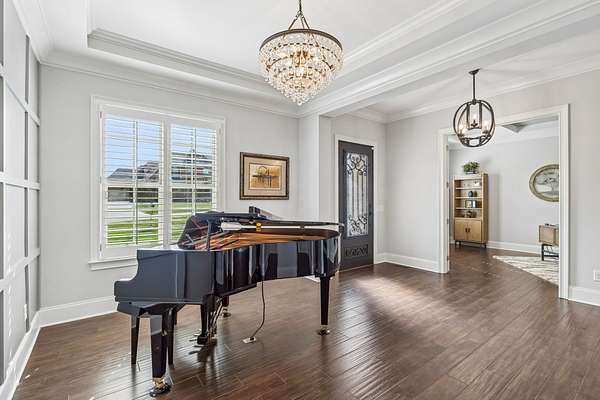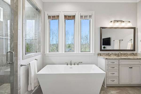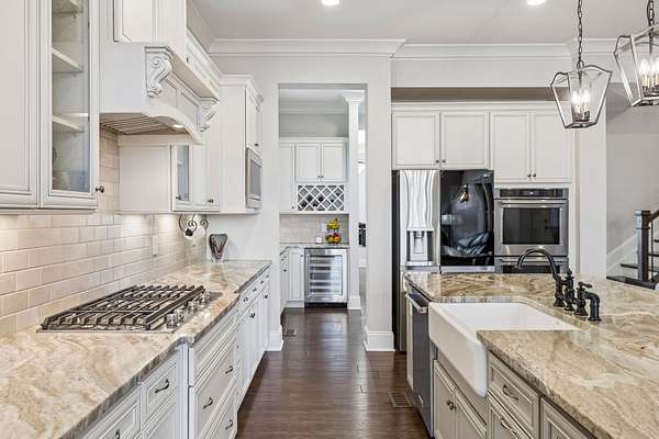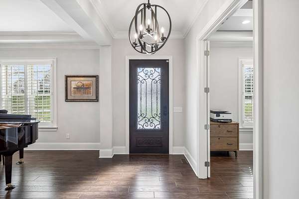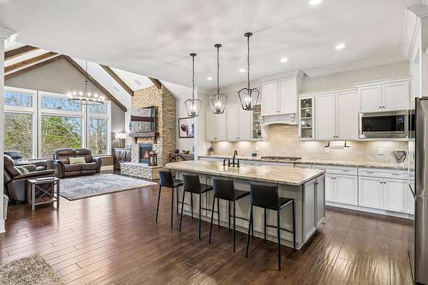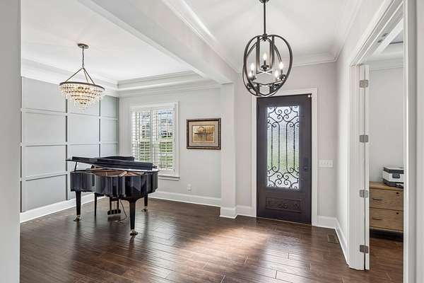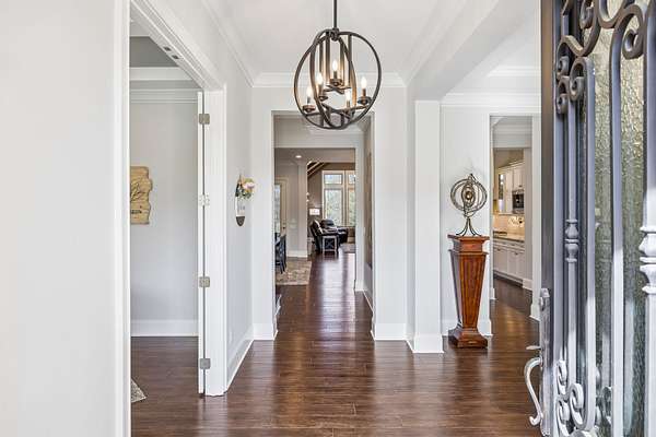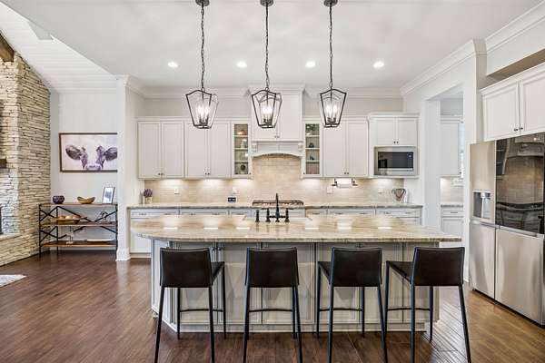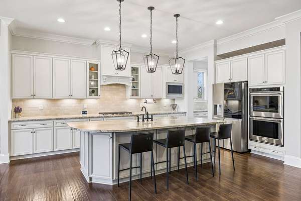 Stately home situated on over 1.5 private acres. Impeccably maintained with incredible upgrades and attention to detail. The home features open living spaces highlighted by a beamed vaulted ceiling in the den, a stone gas fireplace, and a wall of windows overlooking the pristine backyard. Beautiful hardwood flooring throughout the main living areas with custom plantation shutters on the front of the home and Duolite Silhouette blinds on the back. The gorgeous kitchen is well appointed with granite countertops, tile backsplash, double ovens, a farmhouse sink, and is complemented by a wonderful butler’s pantry with wine rack and beverage cooler. The spacious primary suite offers lots of natural light, an organization alcove or coffee bar, and an oversized soaking tub and separate shower in the primary bath. The incredible laundry room offers abundant cabinetry and space for a full-size refrigerator. Need an office? This home office features French doors and a beautiful coffered ceiling, providing an elegant work-from-home space. Upstairs, the large bonus room is complete with a wet bar and beverage cooler. New gas water heater recently installed. The outdoor living is just as impressive as the indoor. The covered back porch features a motorized retractable screen and opens to a large deck overlooking the beautifully maintained backyard. A new roof was installed in July, 2025, and there's extensive landscaping with a 19-zoned irrigation system to keep landscaping looking lush. A 4-plank black fence was installed along the south side of the backyard. The garages have an epoxy flooring, utility sink, and custom cabinetry. There's incredible storage space under the deck where all the lawn equipment can be stored. Large side yard with additional privacy provided by adjacent HOA-owned space, This exceptional property offers space, privacy, and high-end upgrades throughout. Please see the photo gallery for specific details noted under each photo.