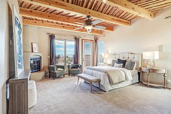 Set on 1.68 serene acres in the prestigious Ridgeline Crest estate in Mariposa, this exceptional custom Rachel Matthews home blends craftsmanship, & luxury. The great room boasts a split cedar-beamed ceiling, & floor-to-ceiling fireplace. A chef's kitchen with designer cabinetry, Viking appliances, granite island with curved prep sink, & a striking barreled brick ceiling, plus a cedar wine closet. The elegant main floor primary suite has a beamed ceiling, fireplace, dual sinks, walk-in shower, & a copper tub with stunning waterfall feature. A 408 sq ft casita with its own entrance, fireplace, wet bar & bath for the ideal home office. Outdoor living with expansive views, a saltwater pool with water falls, covered patios & grill. Newer carpet, 3 car garage, ac, central & radiant floor heat.