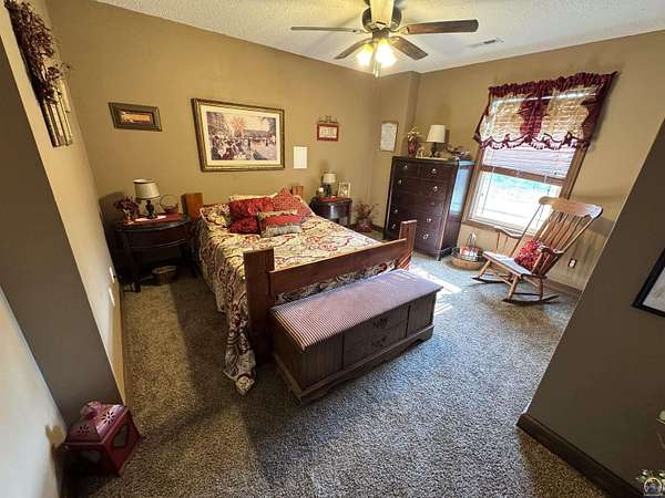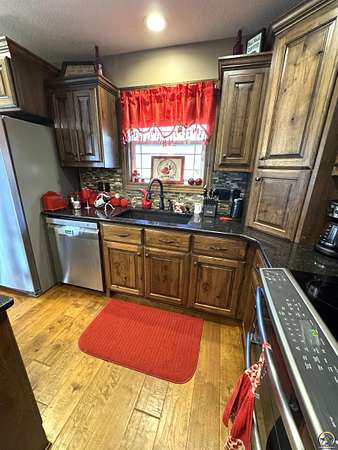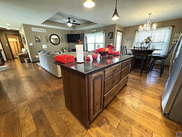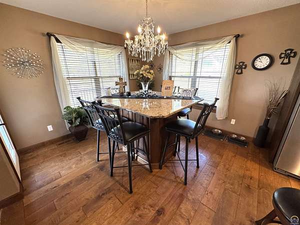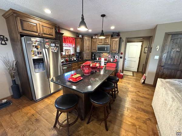 Est $3,172/moPRICE REDUCED! Beautiful 5-bedroom, 3-bath home with a 3-car garage and an additional outbuilding, all situated on nearly 5 acres. This home features an open-concept layout, a kitchen with stone countertops, a pantry, and a built-in dining table. The inviting living room includes a gas fireplace, and the primary bedroom, located on the main floor, boasts an en-suite bathroom. The finished walkout basement offers three additional bedrooms, a wet bar, a concrete storm room, and a spacious family room. Outside, you'll find a covered porch, a covered deck, and a patio, along with an outbuilding and a yard suitable for horses.