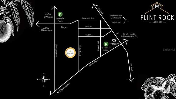 From Archer Road, travel north on SW 122nd Street/Parker Road. Flint Rock Agrihood is approximately 3 miles north on the left. From Newberry Road, travel south on SW 122nd Street/Parker Road. Flint Rock Agrihood is approximately 4.5 miles south on the right.