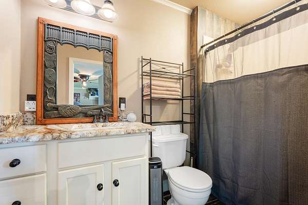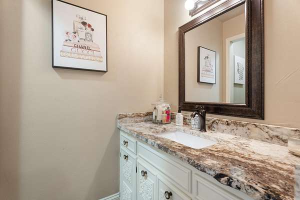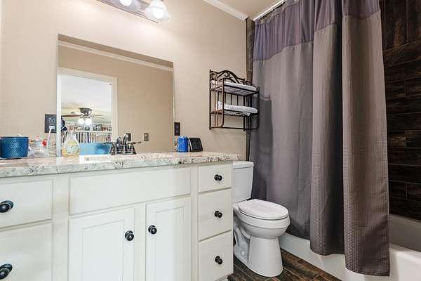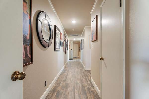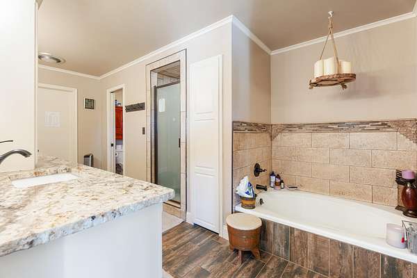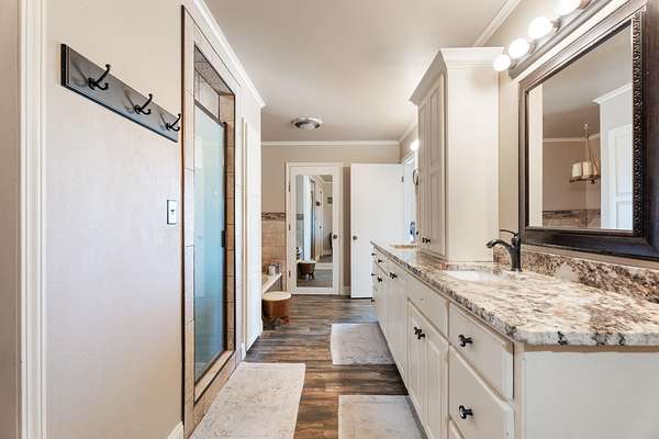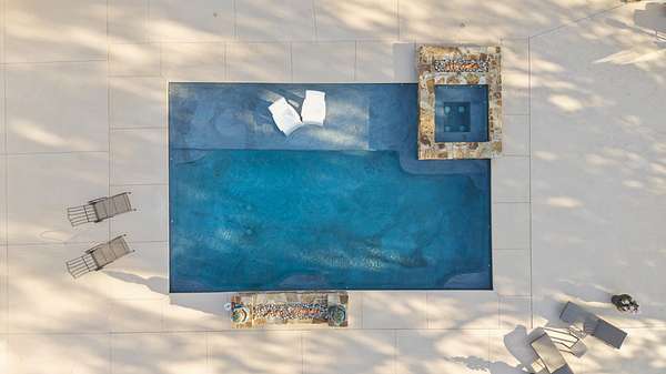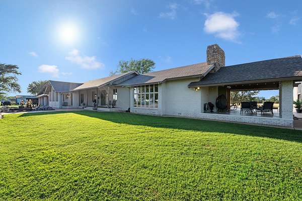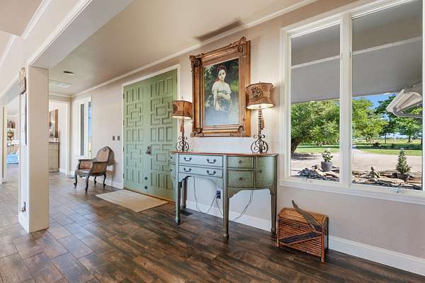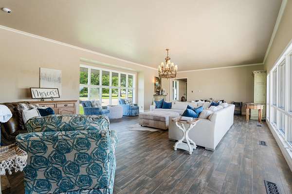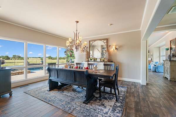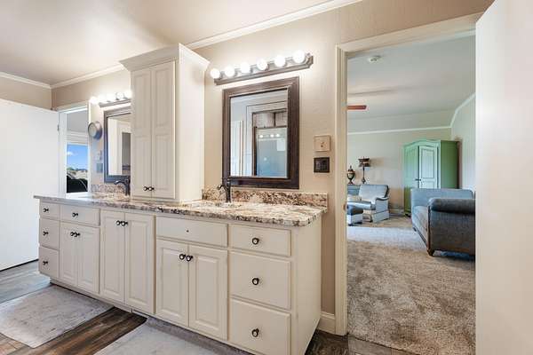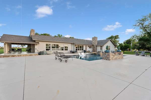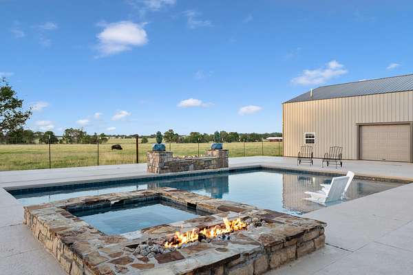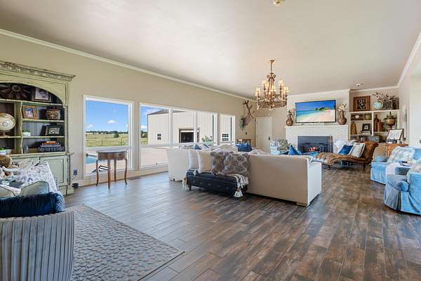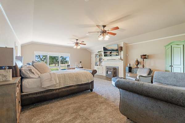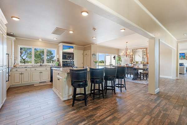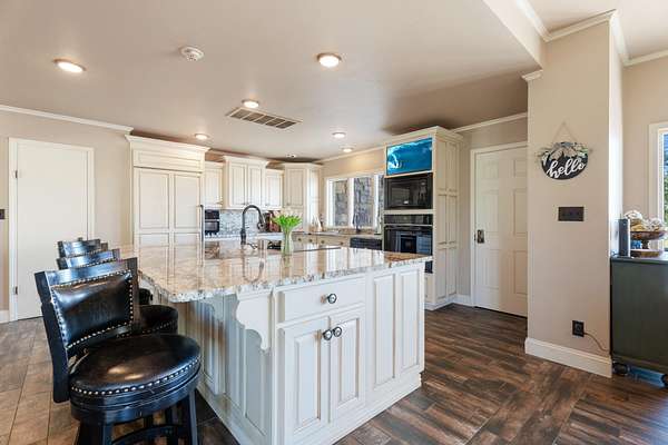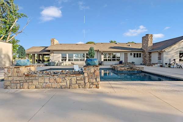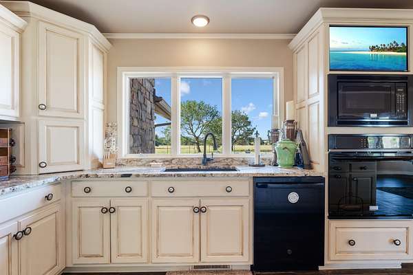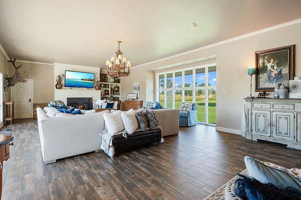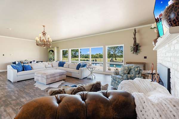 The spacious kitchen features updated cabinets, granite countertops, a large island with a second sink, a built-in freezerless refrigerator, under-cabinet icemaker, and generous storage. The expansive living room boasts 10-ft ceilings, a fireplace, and floor-to-ceiling windows that frame views of the in-ground gunite pool, waterfall, fire features, and open fields where buffalo graze. The split floor plan includes three bedrooms, each with its own en-suite bathroom. The primary suite offers vaulted ceilings, a cozy fireplace, and a luxurious bath with double vanities, two individual walk-in closets, a soaking tub, and a walk-in shower. The oversized laundry room includes a utility sink, second refrigerator with water hook-up, and serves as the hub for the property's 11-camera security system.
